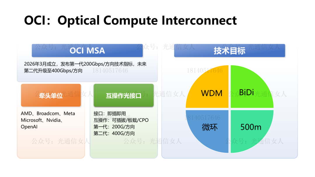 2023年写过Intel的硅光技术如微环调制器等可以用于OCI,Y9T96 用于OCI的CPO硅光模块2024、2025年也写过AMD等厂的各种微环调制器波分复用的硅光方案,Y10T164 AMD 小半径64Gbps微环调制器Y11T145 AMD 基于微环结构的热调锁波OCI,光计算互联,MSA,多源协议。2026年OFC期间,OCI MSA成立,有AMD,博通、Meta、微软、英伟达这些厂。发