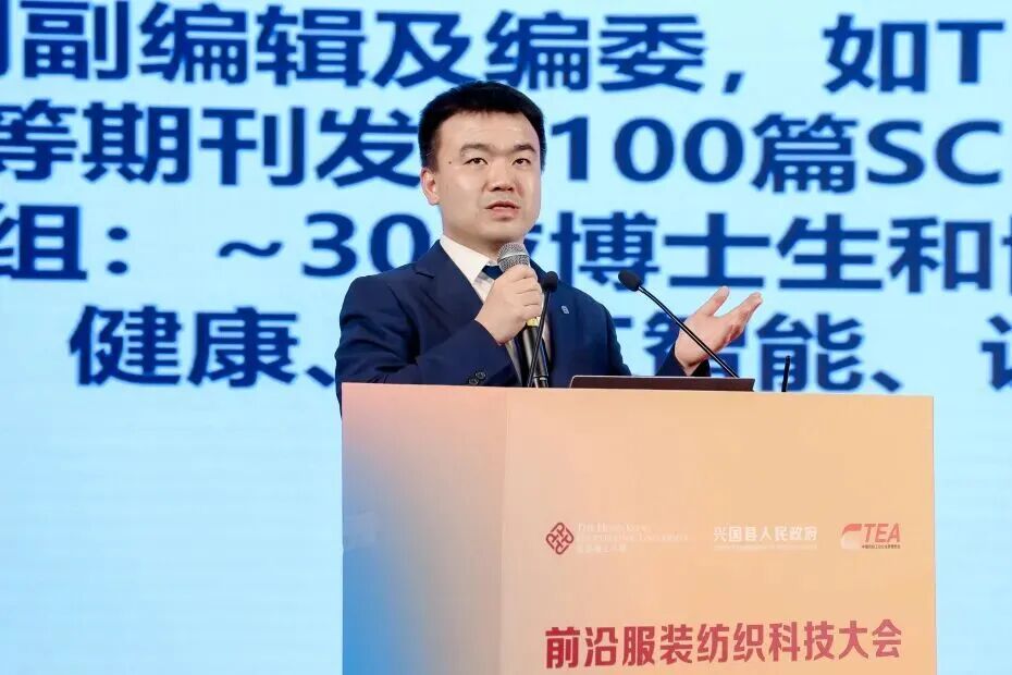 香港理工大学时尚与纺织学院(SFT)副教授、香港理工大学兴国研究院副院长寿大华在报告中系统阐述先进纺织与智能可穿戴领域的前沿突破。他通过仿生电控超快导汗运动服、单向排汗与高效辐射制冷一体化面料、自适应热环境智能软体机器人服装以及可穿戴无创健康监测汗液传感系统等代表性案例,展示纤维新材料在环境自适应响应、热湿协同精准调控、快速单向导汗与高效降温集成、全织物柔性电子融合等方面的核心优势、应用拓展与产业转化路径。