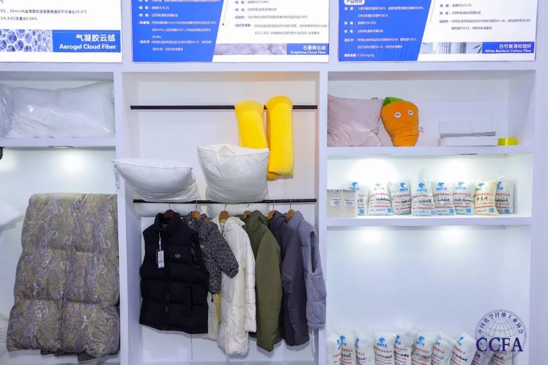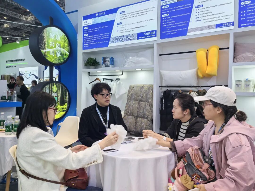 江苏海科总经理李辰昊详细介绍了“云绒”系列四大核心产品:石墨烯云绒、气凝胶云绒、姜暖云绒、仿生发热绒,聚焦轻质锁温、主动健康、抑菌驱螨、远红外保健、仿生发热等方向,标志着再生填充纤维从“低端填充料”向“高端功能性材料”的跃升。