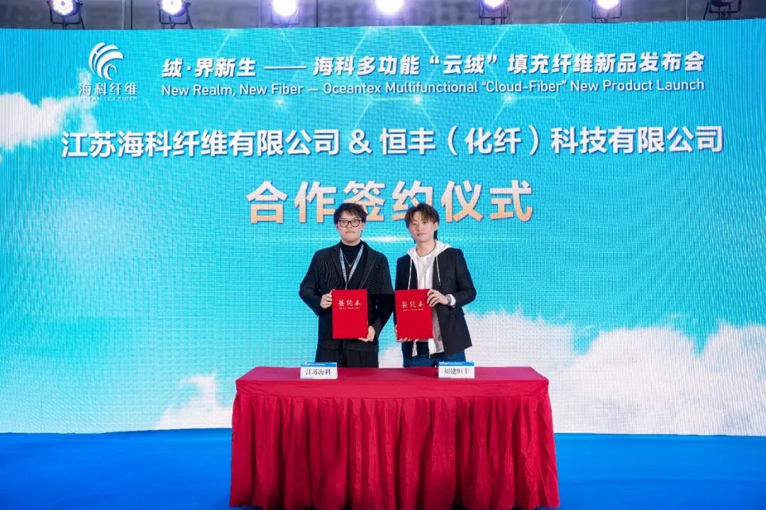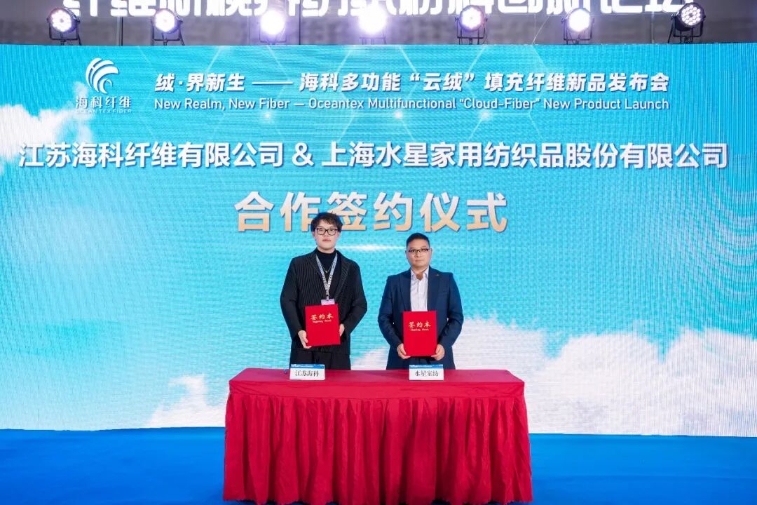 会上,江苏海科与上海水星家用纺织品股份有限公司、上海硕特无纺布有限公司、恒丰(化纤)科技有限公司3家合作伙伴签署战略合作协议,标志着云绒系列产品正式进入市场化布局阶段,产业链协同迈出关键一步。