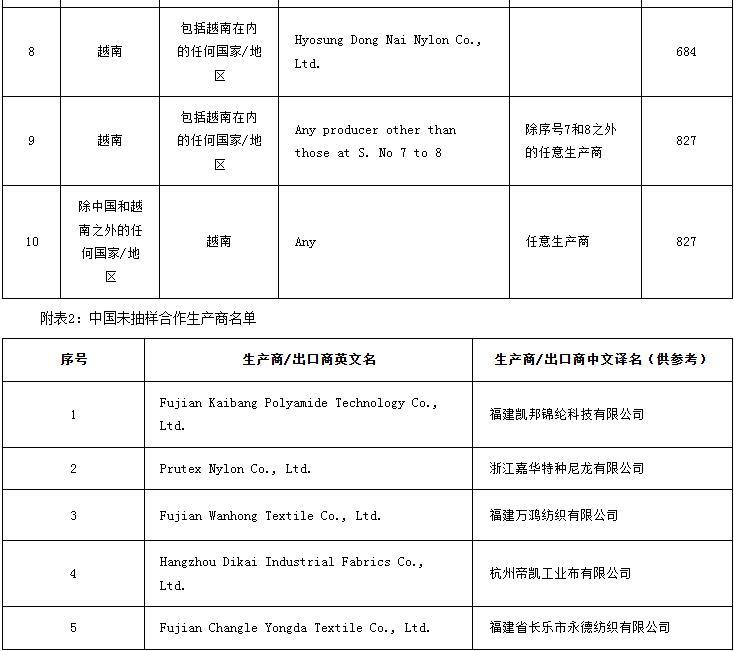 自中国和越南的尼龙长丝纱线(Nylon Filament Yarn)作出反倾销肯定性终裁,建议对上述国家的涉案产品征收反倾销税,有效期为5年,征税如下:中国为236-782美元/吨,越南为684-827美元/吨,征税详情见附表1和附表2。本案涉及印度海关编码5402项下的产品。涉案产品不包括所有不含尼龙或聚酰胺的人造长丝纱线。以下产品被明确排除在涉案产品范围之外:单丝纱线、散装连续纱线、尼龙66纱线、热熔纱线、低熔点纱、粘合纱、导电纱、抗静电纱、诺梅克斯和芳纶纱、840旦及以上高强度纱。