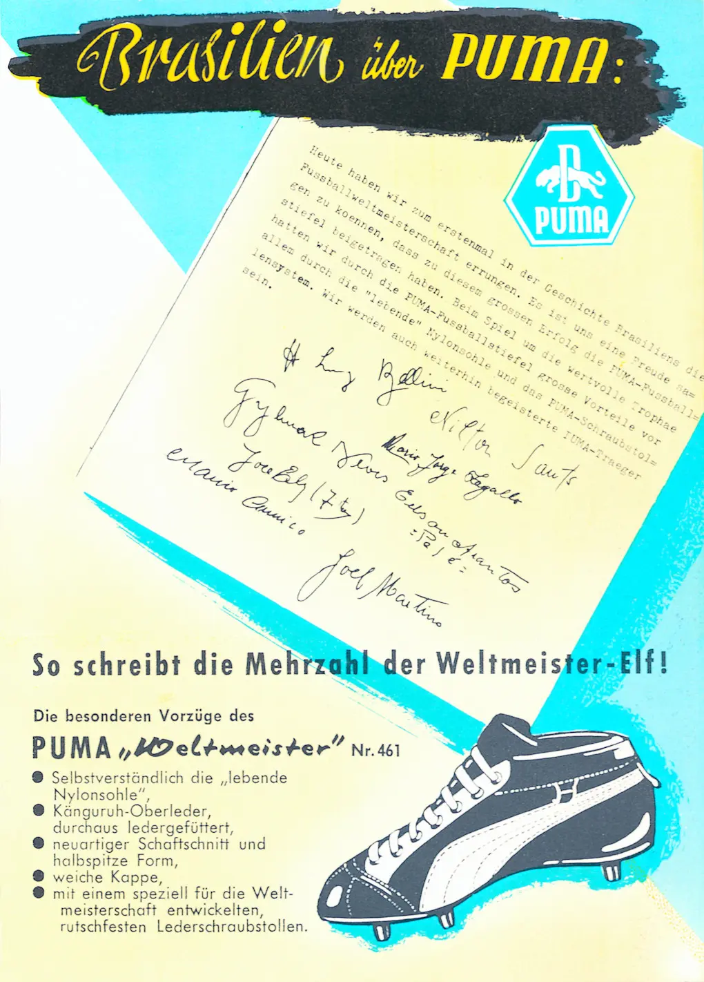 PUMA TACKLE 的原型诞生于 20 世纪 60 年代欧洲浓厚的足球氛围中。这一时期,PUMA 创始人 Rudolf Dassler 正致力于解决皮革球鞋在剧烈运动中易变形的难题,由此在 1958 年研发出一种从鞋侧延伸至足弓的皮革补强带,这便是经典的 Formstrip 设计的由来——最初是为了给运动员提供实质性的侧向支撑与包裹感。