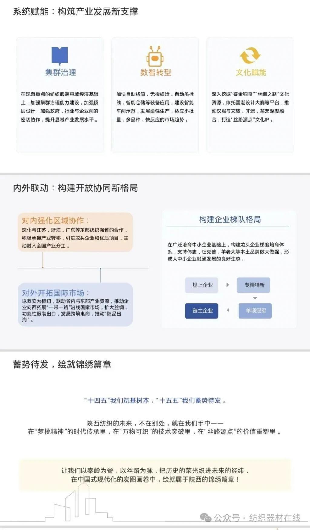 报告立足智能制造前沿视域,紧扣制造业数字化转型、绿色低碳发展与高端化升级的三大时代脉搏,系统梳理了陕西纺织产业转型升级的战略图谱、实施路径与实践逻辑,深入剖析了技术赋能、平台支撑、集群联动与生态协同的多维演进机制。唯有以高瞻远瞩的战略眼光洞察产业变革方向,以全局统筹的系统思维强化产学研用深度融合的协同创新生态,方能精准把握新一轮科技革命与产业变革的历史性机遇,在日趋激烈的区域竞争与全球价值链重构中抢占先机、赢得主动、塑造不可替代的新质竞争优势。