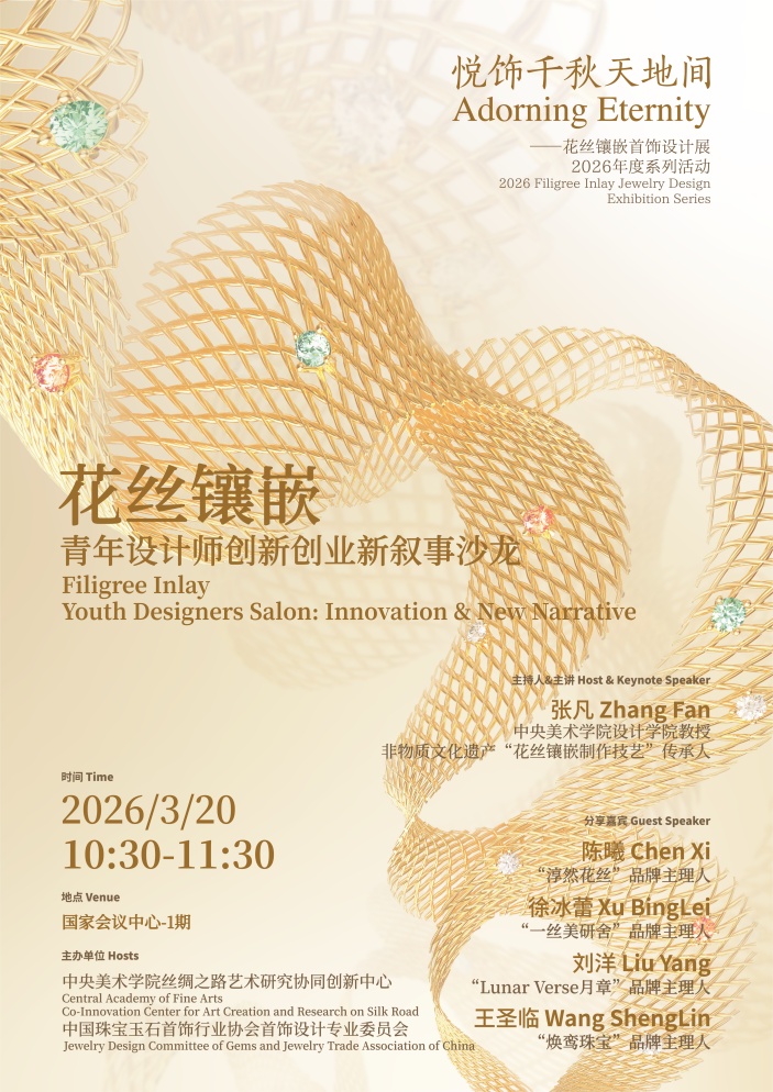 3月20日,中央美术学院丝绸之路艺术研究协同创新中心与中国珠宝玉石首饰行业协会首饰设计专业委员会在2026北京国际珠宝展期间举办“花丝镶嵌青年设计师创新创业新叙事沙龙”,邀请设计品牌主理人探讨非遗赋能品牌新叙事,让传统技艺真正“活”在当代、“融”入生活、“创”造价值,进一步推动“悦饰千秋天地间”展览知识产权(IP)的引领价值与持续的品牌效应。沙龙由中央美术学院设计学院教授、花丝镶嵌技艺传承人张凡主持,陈曦、徐冰蕾、刘洋、王圣临等青年设计师将分享各自在传统工艺与现代设计融合中的实践与思考。