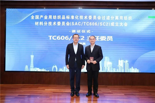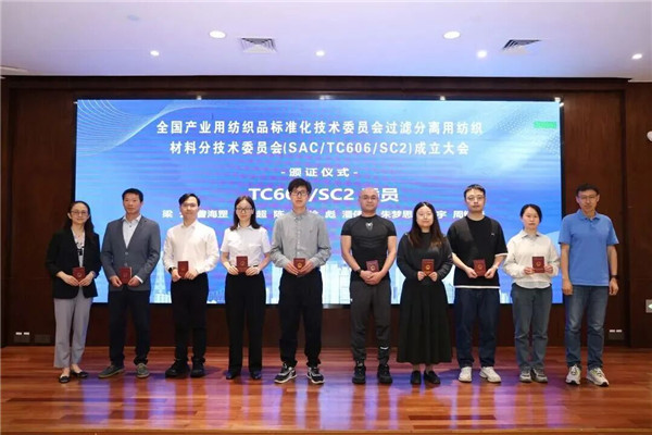 随后中国纺织工业联合会科技部标准处处长王国建在会议上宣读国家标准化管理委员会关于成立全国产业用纺织品标准化技术委员会过滤分离用纺织材料分技术委员会的公告。第一届全国过滤分离用纺织材料分标委(SAC/TC606/SC2)由51名委员组成,李昱昊任主任委员,冯文、柳静献、刘飞飞任副主任委员,朱锐钿任委员兼秘书长,黄景莹任委员兼副秘书长,秘书处由广州检验检测认证集团有限公司承担。