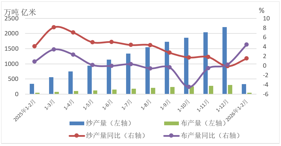 1-2月份,规模以上纱产量为330.8万吨,同比增长1.51%,由上年全年累计下降转为增长,规模以上布产量为43.6亿米,同比增长4.43%,延续上年全年累计增长趋势,且增速高于纱产量。