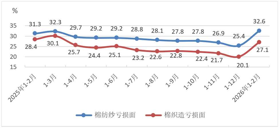 1-2月份,规模以上棉纺织企业亏损面为30.4%,较上年全年累计扩大7.0个百分点,其中棉纺纱和棉织造亏损面分别为32.6%和27.1%,较上年全年累计分别扩大7.2和7.0个百分点。