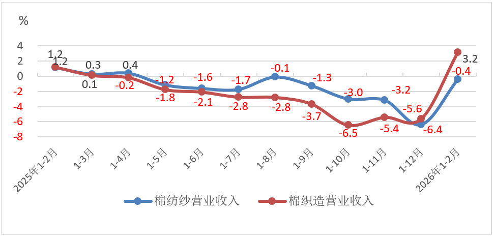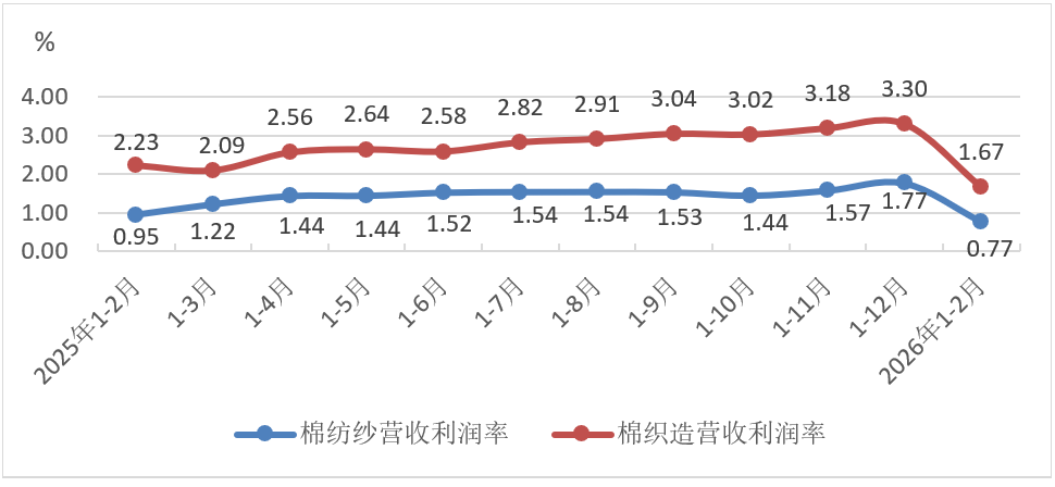 据国家统计局数据,2026年1-2月规模以上棉纺织企业营业收入同比增长0.8%,利润总额同比大增18.6%,两项指标均由上年全年累计下降转为增长,但营业收入利润率仅为1.08%,其中棉纺纱仅为0.77%,低于上年全年累计和上年同期同比数据。
