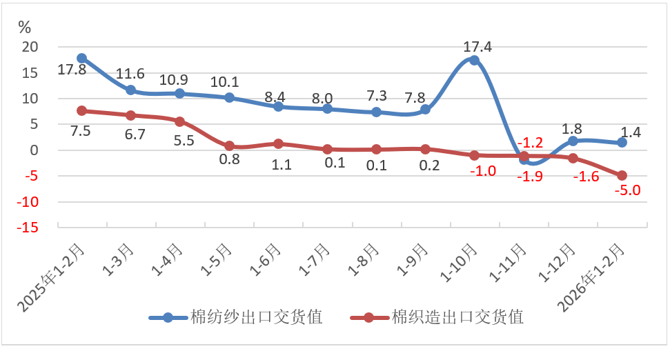 1-2月份,规模以上棉纺织企业出口交货值同比下降3.0%,延续上年全年累计下降趋势且降幅进一步加深,其中棉纺纱延续增长势头,同比增长1.4%,较上年全年累计增速收缩0.4个百分点,棉织造延续下降趋势,降幅为5.0%,较上年全年累计降幅扩大3.4个百分点。