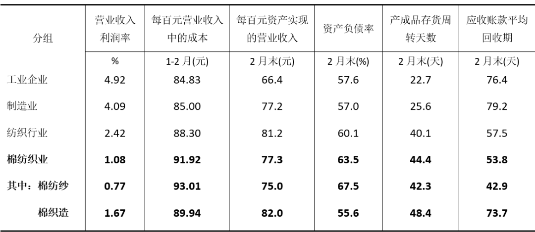 1-2月份,规模以上棉纺织企业营业收入利润率仅为1.08%,棉纺纱和棉织造均不及上年全年累计和上年同期,其中棉纺纱仅为0.77%,自上年同期以来首次降至“1”字头以下,棉织造仅为1.67%,自上年同期以来首次降至“2”字头以下.