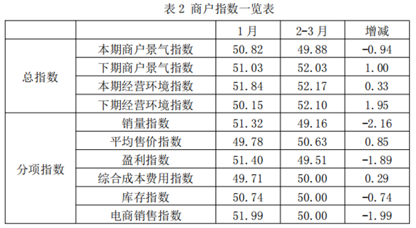 从商户景气指数来看,总指数中,2-3月商户景气指数为49.88,较上期下降0.94个百分点;经营环境指数为52.17,较上期上升0.33个百分点。