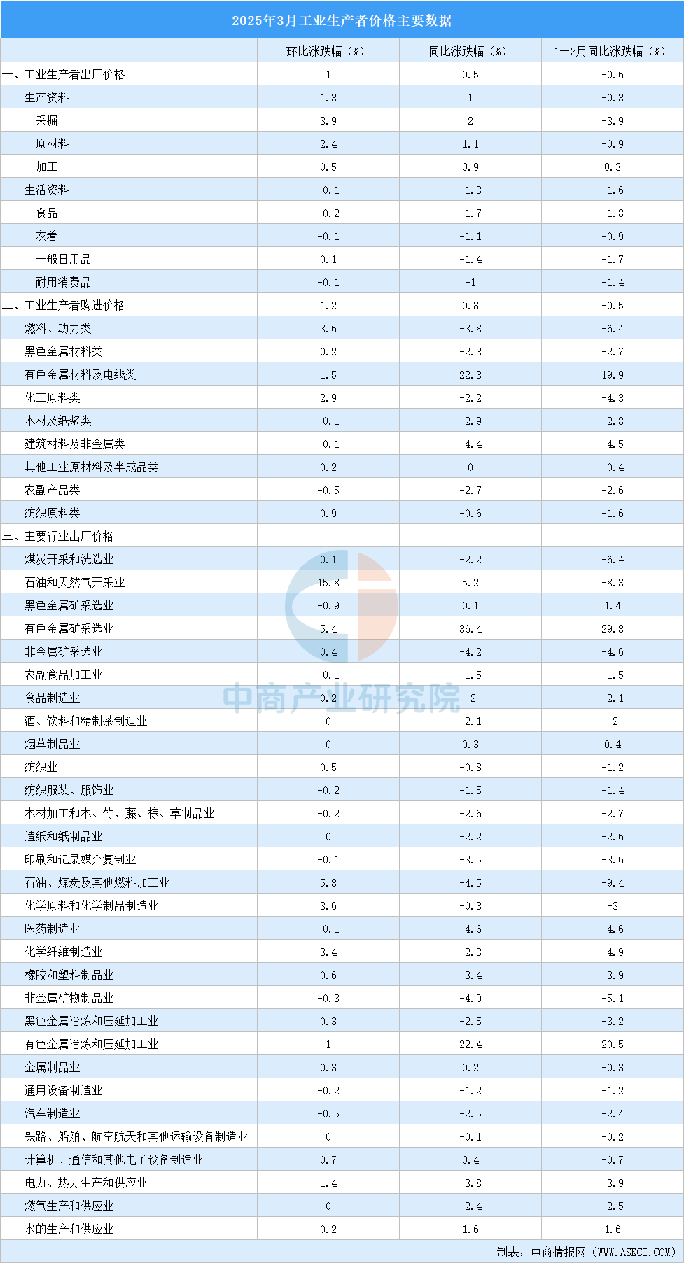 3月份,工业生产者出厂价格中,生产资料价格上涨1.0%,影响工业生产者出厂价格总水平上涨约0.81个百分点。其中,采掘工业价格上涨2.0%,原材料工业价格上涨1.1%,加工工业价格上涨0.9%。生活资料价格下降1.3%,影响工业生产者出厂价格总水平下降约0.28个百分点。其中,食品价格下降1.7%,衣着价格下降1.1%,一般日用品价格下降1.4%,耐用消费品价格下降1.0%。