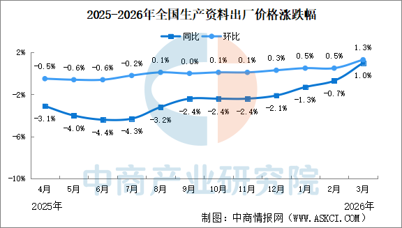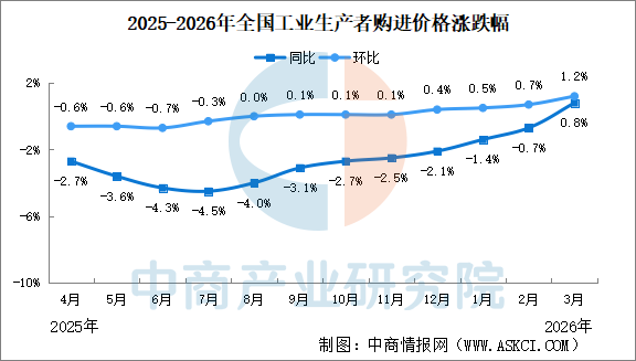 中商情报网讯:2026年3月份,全国工业生产者出厂价格同比由上月下降0.9%转为上涨0.5%;环比上涨1.0%,涨幅比上月扩大0.6个百分点。工业生产者购进价格同比由上月下降0.7%转为上涨0.8%;环比上涨1.2%,涨幅比上月扩大0.5个百分点。一季度,工业生产者出厂价格比上年同期下降0.6%,工业生产者购进价格下降0.5%。