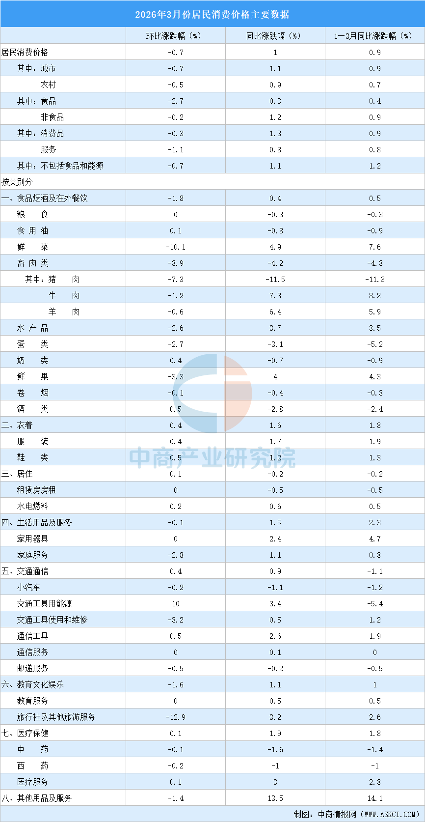 中商情报网讯:2026年3月份,全国居民消费价格同比上涨1.0%。其中,城市上涨1.1%,农村上涨0.9%;食品价格上涨0.3%,非食品价格上涨1.2%;消费品价格上涨1.3%,服务价格上涨0.8%。1—3月平均,全国居民消费价格比上年同期上涨0.9%。