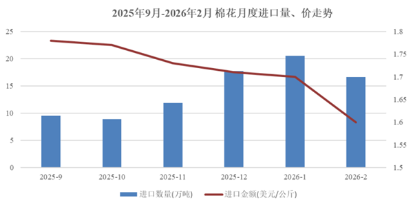 据海关总署数据,2月我国进口棉花16.6万吨,环比下降18.9%,同比增长44%。主要来源国以巴西为主,占比为71.4%,澳大利亚、美国分别占7.6%和5.1%。2026年前2个月累计进口棉花37.2万吨,同比增长41%。