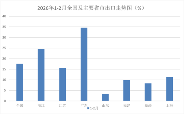 1-2月,排名前7的重点地区出口恢复增长,浙江、江苏、广东、山东、福建、上海和新疆分别增长24.6%、15.6%、34.6%、3.4%、9.9%、11.3%和8.3%。全国31个省(市、区,不含港、澳、台)中的27个实现出口增长,其中安徽(17%)、河北(23%)、江西(10%)增幅较大。