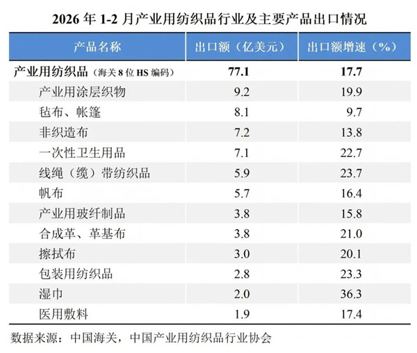 国际贸易方面,行业出口实现较快增长。根据中国海关数据(海关8位HS编码统计数据),2026年1-2月我国产业用纺织品行业的出口额为77.1亿美元,同比大幅增长17.7%;行业进口额为8亿美元,同比微增0.1%。