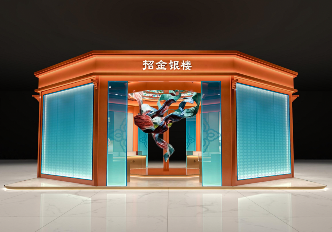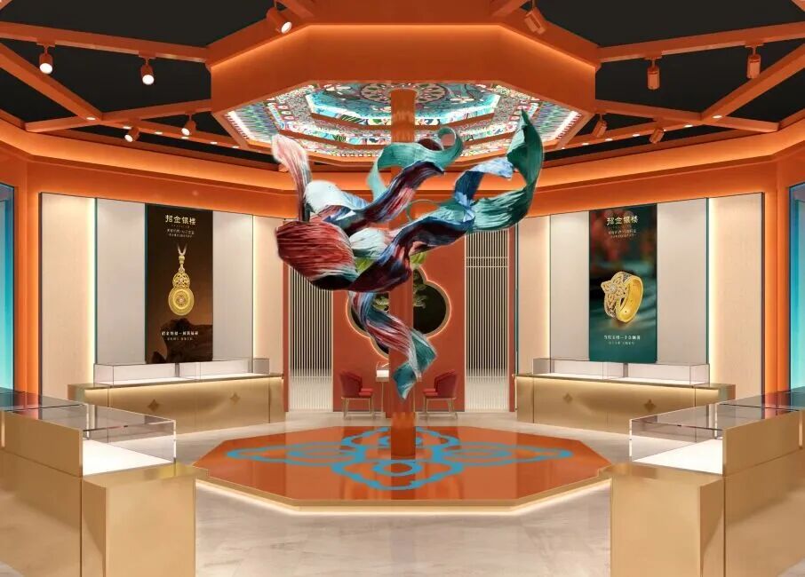 不同于以产品陈列为主的传统黄金展位,招金银楼本次将以敦煌藻井为设计灵感,打造“文化体验+场景消费+社交互动”的全新展陈空间。展位顶部复刻329窟藻井造型、中心设置“飞天丝带”艺术装置、底部融入“当代宝相”图案,将千年敦煌文化与现代设计语言深度融合,构筑起一座“流动的东方美学殿堂”。展位内部将重点呈现“当代宝相”“敦煌盛饰”“招金囍·饰”“招金纳福”四大主题系列产品,以全新“人货场”逻辑,营造沉浸式东方美学场景叙事,让传统文化与当代审美在消博会的舞台上实现深度对话。