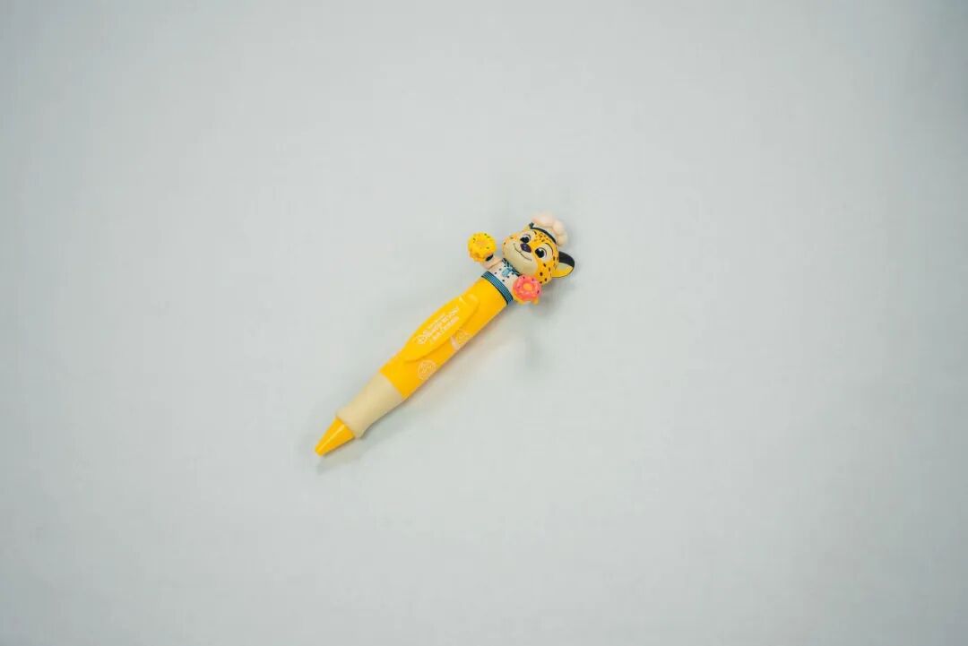 这支笔是我在迪士尼买的,当时看到就觉得一定要带走。它最有意思的地方是上面那个甜甜圈,是可以按动、会上下动的,有点像一个小机关。我当时还开玩笑说,要用这支笔去签所有的报销单和合同。它已经跟了我两三年了,是在《疯狂动物城》刚开园那段时间买的。虽然是一个很小的东西,但一直留在身边,也变成了一种习惯。