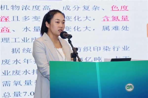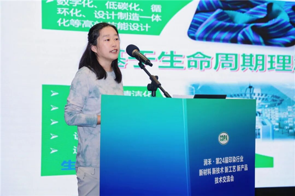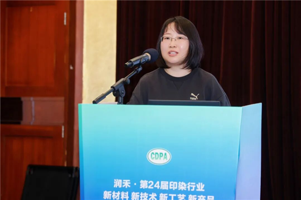 以《锦/棉织物深浓色无氮印花及高牢度固色工艺开发》为题进行了分享。针对当前印染废水含氮量高、深浓色织物固色难湿处理色牢度差、智能化和品质有待进一步提升等行业共性难题,结合企业实践,她详细就深浓色系织物高色牢度染整关键技术、低氮排放的生态染料印花关键技术、高效智能染整装备改进的工艺和技术创新进行了介绍,该工艺在高色牢度、氮近零排放、提升效率以及节能降耗等方面具有显著的社会经济效益与环保效益优势。目前,该研究成果已在华纺实现了产业化生产。