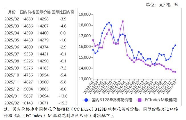 【本月特点】国内棉价继续上涨,国际棉价持平略跌 【后期走势】国内市场:新疆棉花调减政策信息被市场逐步接受,内外棉价差持续扩大将增加棉花进口,预计后期国内棉价高位震荡。国际市场:供需预期转紧缓解国际棉价下行压力,预计国际棉价有望止跌回升。 【详情】 (一)国内棉价环比上涨。新疆维吾尔自治区政府工作报告中提出,2026年新疆棉花总产稳定在560万吨左右(较2025年616.5万吨减9.2%),市场预期