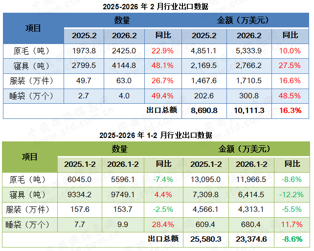 2026年2月,我国羽绒行业出口总额约1.0亿美元,与2025年同期相比上涨16.3%。其中,寝具出口增幅领跑,出口数量和金额同比分别增长48.1%、27.5%;原毛和服装均有不同程度涨幅,出口额同比分别增长10.0%、16.6%。原毛、寝具和服装出口金额涨幅均小于数量涨幅,出口平均单价均有所下调。 综合1-2月来看,行业出口总额约2.3亿美元,同比下滑8.6%。其中,1月行业出口总额约1.3亿美