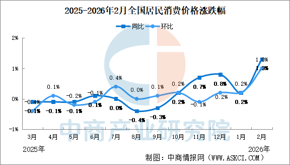中商情报网讯:2026年2月份,全国居民消费价格同比上涨1.3%。其中,城市上涨1.4%,农村上涨0.9%;食品价格上涨1.7%,非食品价格上涨1.3%;消费品价格上涨1.1%,服务价格上涨1.6%。1—2月平均,全国居民消费价格比上年同期上涨0.8%。 2月份,全国居民消费价格环比上涨1.0%。其中,城市上涨1.0%,农村上涨0.7%;食品价格上涨1.9%,非食品价格上涨0.8%;消费品价格上涨