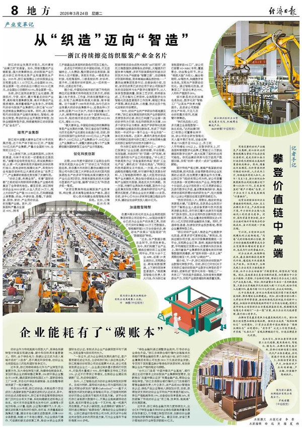 浙江纺织业发展历史悠久,杭州素有“丝绸之府”的美誉。如今,凭借完整的产业链配套,强大的集群效应,纺织服装产业已成为浙江的传统优势产业和重要民生产业。2025年,浙江省规模以上纺织服装企业实现营业收入1.12万亿元,占全国的25.5%,居全国第一位;纺织品出口额达953.31亿美元,占全国出口总额的32.4%,居全国第一位。 当前,浙江坚持走新型工业化道路,围绕杭州、宁波、绍兴、嘉兴等重点纺织产业带