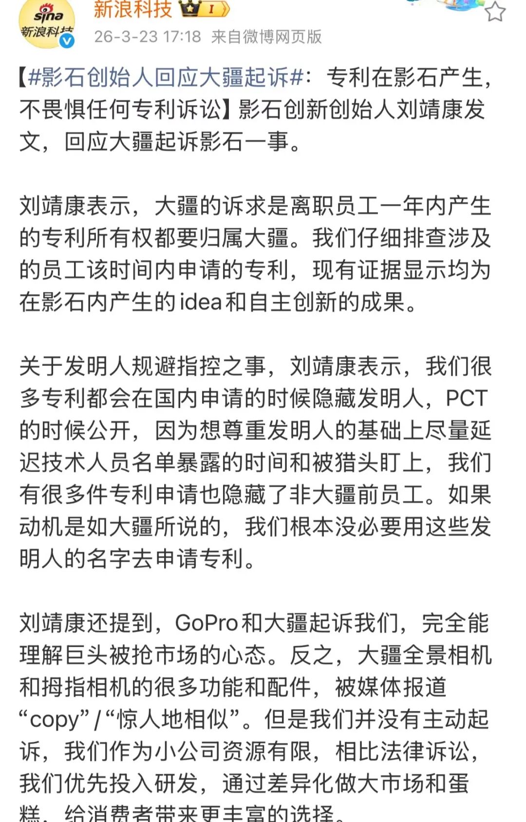 针对此次诉讼,影石创新CEO刘靖康第一时间作出回应。