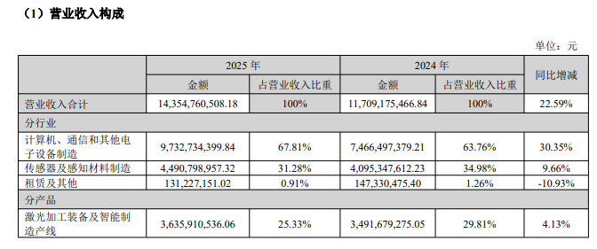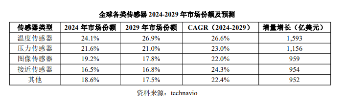 海量传感器知识、行业报告,请在公众号对话框回复关键词【资料下载】获取,部分资料查看《传感器专业知识资料100+,总有一份适合你~》这里👇关注我,记得点右上角菜单栏•••键👉设为星标⭐今日(3月26日),A股千亿市值传感器巨头华工科技,发布2025年业绩报告,具体财务数据为:报告期内,公司实现营业收入143.55亿元,同比增长22.59%;归属于上市公司股东的净利润14.71亿元,同比增长20.48%;扣除非经常性损益后的净利润11.87亿元,同比增长32.32%;经营活动产生的现金流量净额12.21亿元,同比增长66.83%。华工科技拟向全体股东每10股派发现金红利2.50元(含税),具体以2025年末总股本10.06亿股剔除回购专用证券账户中已回购股份980万股后的股份9.96亿股为基数,合计分配现金2.49亿元。此前的两个年度,华工科技已分别现金分红2.01亿元和1.51亿元。华工科技成立于1999年,脱胎于中国知名学府——华中科技大学,2000 年在深圳证券交易所上市,目前已形成了以信息通信技术为重要支撑的联接业务,以敏感电子技术为重要支撑的感知业务,以激光加工技术、软件算法为重要支撑的智能制造业务三大业务格局。其中,报告期内,华工科技联接业务实现营业收入60.97 亿元,同比增长 53.39%;感知业务营业收入 40.27 亿元,同比增长 9.78%;公司智能制造业务营业收入 36.36 亿元,同比增长4.13%。值得一提的是,2025年,华工科技全年实现海外营收 20 亿元,同比增长46%。感知业务:温度传感器占据全球70%市场份额,构筑温度、压力等传感器全球技术领导地位,向多维智能感知跃迁公司持续巩固新能源汽车热管理和温度、压力、湿度、光、空气质量、气体等系列传感器全球技术领导地位,自主掌握传感器用敏感陶瓷芯片制造和封装工艺的核心技术。报告期内,公司感知业务营业收入 40.27 亿元,同比增长 9.78%。公司积极从“单一感知”向“多维集成智能感知”、从“单一零件”向“集成模块”跃迁,形成智慧家居、新能源及智能网联汽车、智慧能源三大支柱市场全覆盖格局。新能源及智能网联汽车市场主导地位进一步强化,国内市场占有率提升至 70%,与海内外头部汽车制造商建立了深度协同。温度传感器、光电传感器在汽车市场渗透率大幅提升;压力传感器进入多家头部车企,销售增速超过 100%;气体传感器获得UL 认证,实现从 0 到 1 量产突破;热管理集成模块首家主机厂项目定点。家电市场通过产品持续迭代,推动行业向智慧化、绿色化升级,合作客户已全面覆盖全球顶级家电品牌。光伏储能领域定点项目规模大幅攀升,覆盖行业头部企业,生态位不断巩固。泰国子公司在市场开拓、产能建设、供应链和团队本地化方面打下坚实基础,海外业务实现明显增长。 在2025年,华工科技感知业务围绕新能源及其上下游产业链、人工智能及物联网感知层发展需求,推进冷媒气体传感器、车载CO₂气体传感器、MEMS MOX 传感器、车载感知集成传感器等战略新产品开发。据此前《第一财经》报道,华工科技传感器日产能达500万只,在温度传感器领域占据全球70%的市场份额。关于传感器市场格局,华工科技在年报中披露,全球传感器市场规模持续增长。近年来,在新能源汽车、工业自动化、医疗、环保、消费等领域智能化、数字化需求的持续带动下,2024-2029 年全球传感器市场呈加速增长态势,2024 年市场规模达2,938 亿美元,预计 2029 年将增至 8,552 亿美元,期间复合年增长率为 23.8%,增量规模达5,614亿美元;市场结构呈碎片化,传感器类型以温度传感器为主导,连接方式以有线传感器占绝对优势(2024年市场份额 95.5%),终端应用中电子行业贡献最大(2024 年市场份额 45.3%),技术层面CMOS技术占比最高(2024 年市场份额 41.9%),地理区域上北美为最大且增长最快的市场(复合年增长率26.1%)。中国传感器市场方面,“十五五”规划明确将“制造业基础再造工程”作为产业升级的核心抓手,传感器作为关键基础零部件,被列为重点突破领域。据赛迪顾问预测,受益于“十五五”政策驱动,我国传感器市场规模将在 2029 年突破 3,500 亿元,复合年增长率达 18.2%,其中高端传感器市场占比将提升至 40%以上。中国新能源汽车的持续增长为热敏传感器创造了增量市场。热管理系统作为保障动力电池安全、提升续航里程及确保乘员舱舒适性的关键子系统,对温度感知的精度与可靠性提出了极高要求,其中PTC 加热器与 NTC 热敏电阻是核心传感与执行元件。普华有策调研报告显示,全球汽车热管理市场规模从 2020 年的 1,695 亿元上升至 2024 年的 2,798 亿元,复合年增长率为 13.4%,预计2030 年全球市场规模将进一步增长至 5,924 亿元。中商产业研究院发布的《2025-2030 年中国汽车热管理行业深度研究及发展前景投资预测分析报告》显示,2023 年中国汽车热管理市场规模约1,800-2,000 亿元,占全球35%以上;至 2030 年,国内市场规模预计将达 4,000-4,500 亿元,复合年增长率约为15-18%。联接业务:全球光模块厂商 TOP 10,多项产品行业领先公司围绕 AI 智能互联、6G 移动通信、F6G 固定通信网络、车载高速光通信等前沿应用场景,产品全面贴合市场需求,为客户提供极具竞争力的智能联接解决方案。在最新一期LightCounting 2024年全球光模块厂商排行榜单中蝉联 TOP 10。报告期内,公司联接业务实现营业收入60.97 亿元,同比增长 53.39%,营收增长主要在 AI 应用领域,公司深度锚定全球化 AI 算力基础设施
