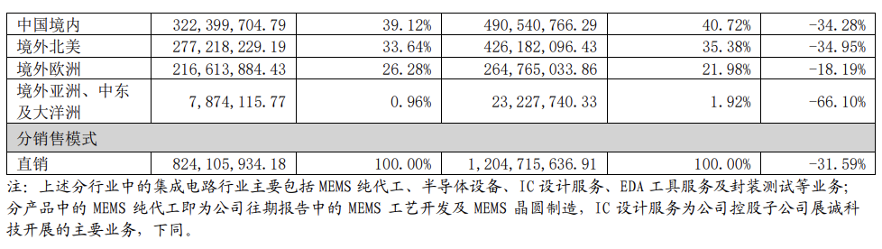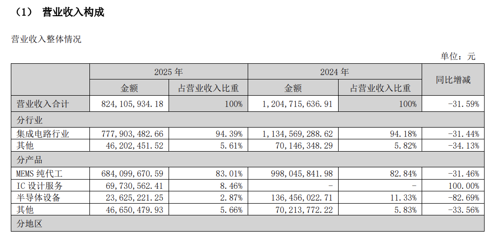 其中,MEMS 晶圆制造实现收入3.94亿元,较上年同期下降 39.98%,MEMS 工艺开发实现收入2.9亿元,较上年同期下降 15.09%。上述变化的主要原因是:瑞典 Silex2025 年 7 月由公司全资子公司转变为公司参股子公司,不再纳入公司合并报表范围。与此同 时,由于北京亦庄 MEMS 量产线仍处于产能爬坡阶段,营收规模体量以及量产产品类别仍相对较少,部分原有量产客户订 单在报告期内因下游市场需求变化产生较大波动,北京亦庄 MEMS 量产线工厂的收入出现下滑,但持续累积各领域客户及 晶圆产品类别。报告期内,赛微电子 MEMS 业务的综合毛利率为 37.86%,较上年同期上升 2.37%;其中 MEMS 晶圆制造毛利率为 34.50%, 较上年同期基本持平,MEMS 工艺开发毛利率为 42.41%,较上年同期上升 2.51%。上述变化的主要原因是:对于 MEMS 晶 圆制造,随着 MEMS 晶圆制造业务的逐步稳定发展,原材料、人工、制造费用等形成的成本结构日趋稳定,毛利率水平趋 于稳定,未来需进一步释放规模效应;对于 MEMS 工艺开发,2025 年产品结构较上年同期有所变化,同时公司采取了有 效的成本控制手段,毛利率较上年同期有所上升。整体而言,瑞典 MEMS 产线(2025 年 7 月出表成为公司参股子公司) 的毛利率继续保持了较高水平,北京亦庄 MEMS 量产线仍处于产能爬坡阶段,其 MEMS 业务的综合毛利率较上年同期略有 提升,公司 MEMS 业务最终在整体上保持了较好的毛利率水平。IC设计服务营收6973.06万元,同比增长100%,营收占比8.46%,新增 IC 设计服务相关成本,主要因为公司收购展诚科技股权,取得其控制权纳入合并范围,新增 IC 设计服务业务所致。
