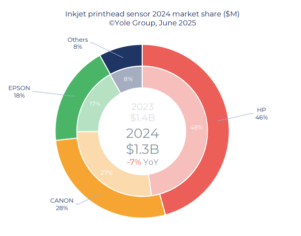 据咨询机构Yole的《Status of MEMS Industry 2025》报告显示,当前全球MEMS喷墨打印头市场主要由惠普、佳能、爱普生三家企业主导。