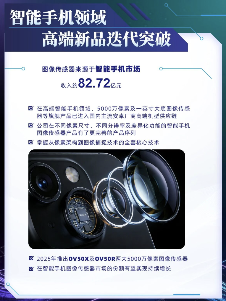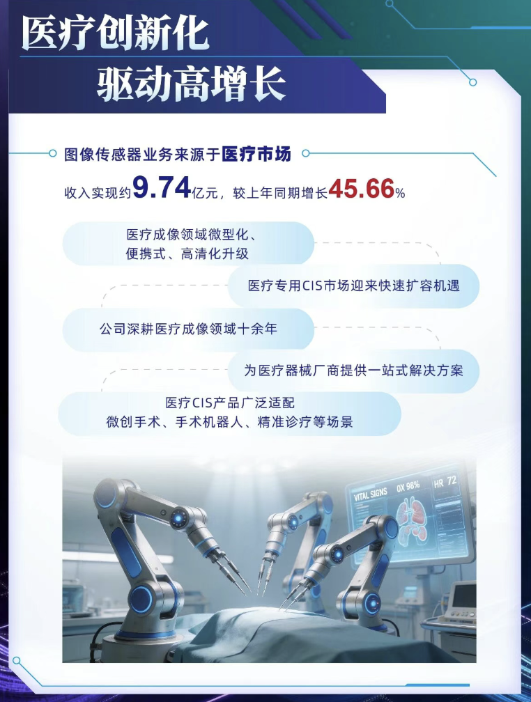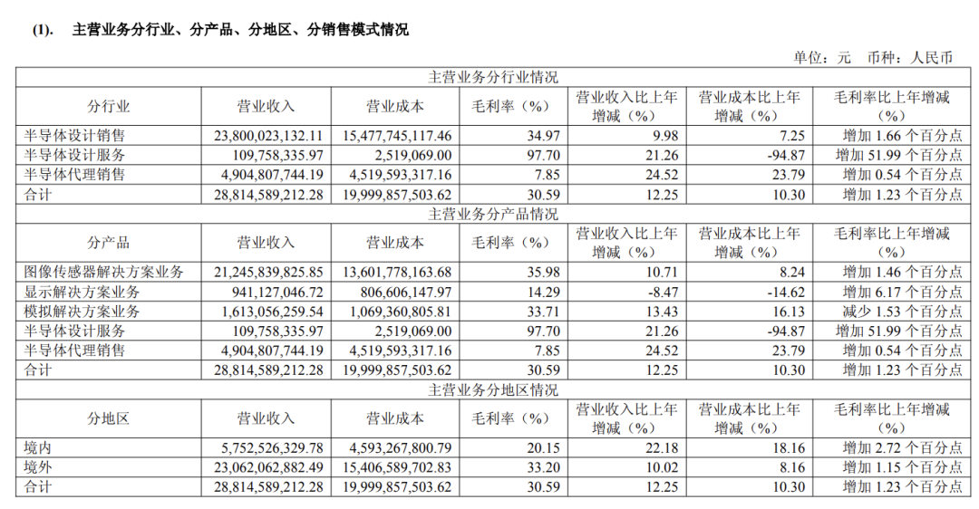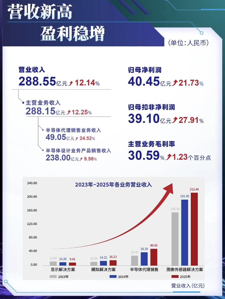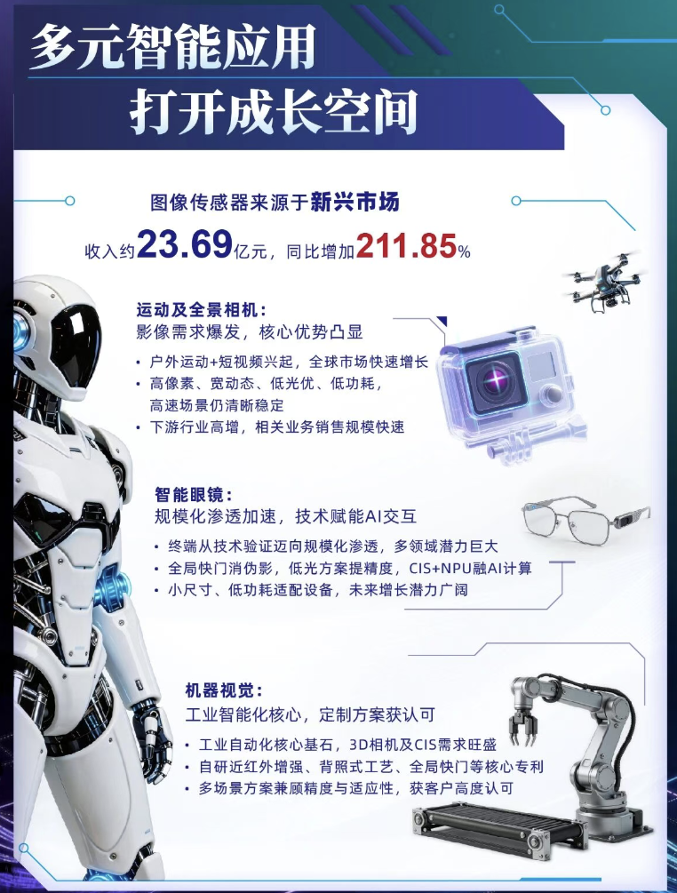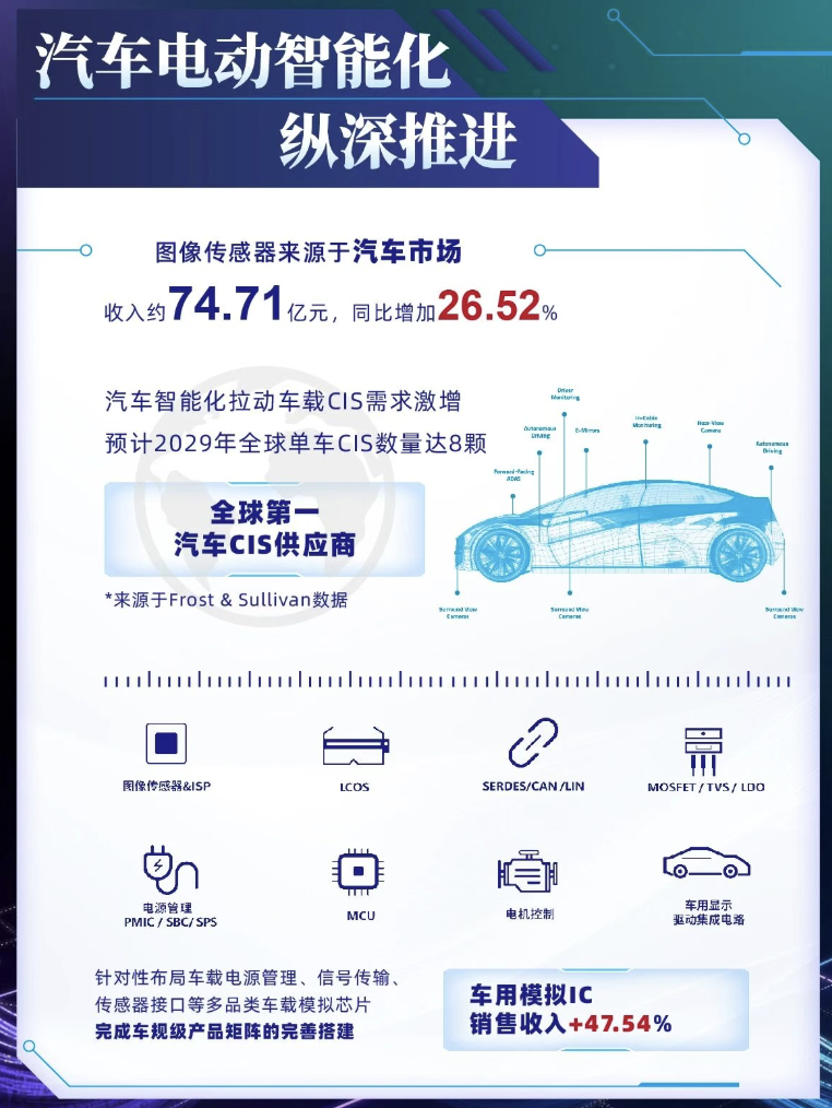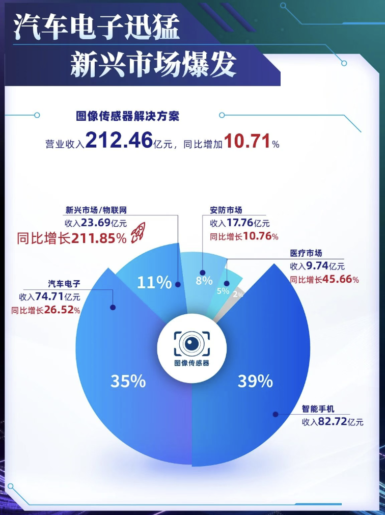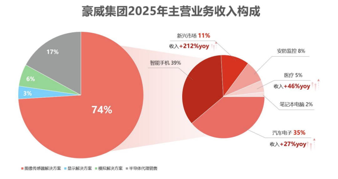 海量传感器知识、行业报告,请在公众号对话框回复关键词【资料下载】获取,部分资料查看《传感器专业知识资料100+,总有一份适合你~》这里👇关注我,记得点右上角菜单栏•••键👉设为星标⭐今日(3月30日)晚间,中国最大、全球第三的CMOS图像传感器公司豪威集团(原韦尔股份),发布2025年度报告,主要财务数据有:2025年公司实现营业收入288.55亿元,较 2024 年增加 12.14%;利润总额46.01亿元,同比增加40.33%;归母净利润40.45亿元,同比增加21.73%;归母扣非净利润39.1亿元,同比增加27.91%;基本每股收益为3.37元。主营业务毛利率30.59%,提升1.23个百分点。期末资产总计为436.01亿元,应收账款为39.44亿元;现金流量方面,经营活动产生的现金流量净额为41.20亿元,销售商品、提供劳务收到的现金为282.30亿元。报告期内,公司营业收入实现稳步增长;在营收规模持续扩张的同时,依托管理效能的持续优化,公司净利润与整体盈利能力同步得到有效释放与稳步提升。分产品营收数据方面,目前,豪威集团旗下业务按行业分类,有半导体设计业务产品、半导体代理销售业务以及半导体设计服务三大板块。其中,半导体设计业务产品销售收入实现 238.00 亿元,占主营业务收入的比例为 82.60%,较上年增加9.98%;公司半导体代理销售业务实现收入 49.05 亿元,占公司主营业务收入的17.02%,较上年增加24.52%。豪威集团半导体设计业务包括图像传感器解决方案、显示解决方案、模拟解决方案三部分。2025 年公司半导体设计业务中,图像传感器解决方案业务实现营业收入212.46 亿元,占主营业务收入的比例为 73.73%,较上年增加 10.71%,毛利率35.98%,较上一年增加1.46个百分点;公司显示解决方案业务实现营业收入 9.41 亿元,占主营业务收入的比例为 3.27%,较上年减少 8.47%;公司模拟解决方案业务实现营业收入 16.13 亿元,占主营业务收入的比例 5.60%,较上年增加13.43%。可以看到,仅以传感器业务计算,2025年豪威集团来自图像传感器的业务营收高达212.46亿元,是目前中国国内公司已公开传感器营收数据中最高的企业。鉴于图像传感器赛道的特殊性——全球最大的单一传感器赛道之一,以及中国传感器产业的整体落后,豪威集团是目前公开数据中,以营收计算,中国传感器业务最大的公司。2025年,豪威集团图像传感器解决方案业务营收增长的主要原因为:主要得益于公司面向汽车智能驾驶及新兴应用市场的图像传感器产品销售收入实现大幅增长。细分来看,来自智能手机领域营收82.72亿元,同比下降 15.61%,占比39%,仍是豪威集团第一个营收来源,业务下降主要受行业整体调整及主力产品周期切换影响。汽车市场的收入实现约 74.71 亿元,较上年同期增加 26.52%,市场份额持续提升——豪威集团已成为全球第一大汽车CIS供应商,相关信息可参看:从60%暴跌到33%,全球汽车CIS传感器绝对王者,被国产巨头干翻。新兴市场实现收入约 23.69 亿元,同比增长达 211.85%;安防市场的收入实现约17.76亿元,较上年同期增长 10.76%;医疗市场收入实现约 9.74 亿元,较上年同期增长 45.66%。值得一提的是,2026 年 1 月 12 日,豪威集团成功完成 H 股发行并在香港联交所主板挂牌上市。本次共发售50,741,100 股 H 股,发行价格每股 104.80 港元,募集资金总额约为53.18 亿港元。相关信息参看:1376亿,刚刚,2026年中国传感器第一股诞生!年度报告中,豪威集团详细阐述了各细分领域的市场变化,以及豪威集团取得的业绩亮点:报告期内,全球汽车产业电动化、智能化趋势持续深化,汽车制造商正不断加大在自动驾驶、车联网和新能源技术领域的投入,中国市场在这一趋势中表现尤为突出。这些产业变革和技术创新为汽车行业带来了新的发展机遇,也推动了公司业务在汽车电子市场销售规模的持续增长。 随着自动驾驶系统及舱内驾驶员监控系统渗透率快速提升,车载摄像头的需求显著增长。中国在新能源汽车及高级辅助驾驶系统领域的快速发展,持续拉动车载CIS 的需求增长。伴随自动驾驶功能不断升级与普及,单车搭载摄像头数量预计稳步提升;同时,人脸识别、手势识别等车内智能化应用持续拓展,进一步带动中国车载 CIS 需求增长。面向更高级别的自动驾驶功能的需求,车载摄像头正朝着高清化、多功能化、智能化和集成化方向发展,以持续满足消费者对驾驶安全性和驾驶体验的不断提升的需求。公司车载CIS 产品实现分辨率显著迭代,800 万像素产品加速普及,高分辨率图像传感器带来成像品质与信噪比的全面优化,为自动驾驶及辅助驾驶场景下的目标识别、环境感知与决策安全提供核心技术支撑。 公司作为全球领先的汽车图像传感器解决方案供应商,凭借二十余年的行业积淀、完善的车规级验证体系及领先的像素及图像处理技术,为市场提供高性能、高可靠性的车载CIS解决方案,产品全面覆盖 ADAS、座舱监控、电子后视镜、仪表盘摄像头、后视与全景影像等应用场景。报告期内,公司紧抓市场机遇,持续推进技术迭代与产品创新,公司推出采用Nyxel®近红外技术的传感器新品,广泛应用于驾驶员监控系统,进一步丰富车规级产品矩阵,为业绩持续增长与市场份额扩大提供新动力。最新一代基于 TheiaCel®技术的汽车图像传感器在关键性能指标上保持行业领先,赢得客户广泛认可。 报告期内,公司图像传感器业务来源于汽车市场的收入实现约 74.71 亿元,较上年同期增加 26.52%,市场份额持