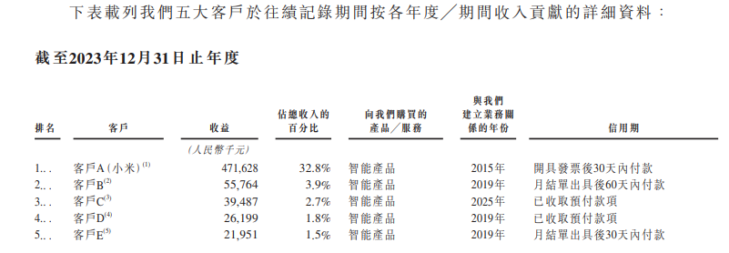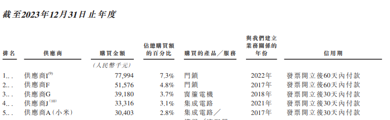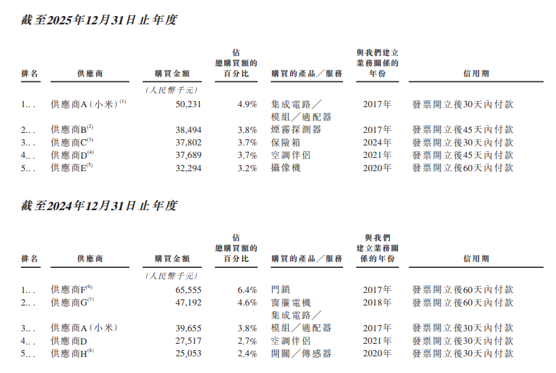 往绩记录期间(2023-2025年),Aqara来自五大供应商的采购额占比分别为21.7%、19.9%、19.3%,其中,来自最大供应商的采购额则分别占同年╱同期总采购额 的7.3%、6.4%、4.9%。Aqara向小米的采购额分别占比4.9%、3.8%、2.8%。可见,Aqara来自各供应商的采购额占比比较分散。