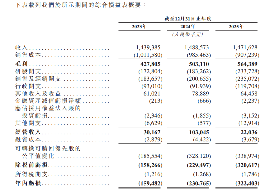 主要财务数据方面,往绩记录期间(2023-2025年),Aqara实现营收分别为14.39亿元、14.89亿元、14.72亿元;往绩记录期间产生淨亏损,2023-2025年间亏损分别为1.6亿元、2.3亿元、3.2亿元。然而,Aqara亦提供了经调整利润(非国际财务报告准则计量)的部分财务数据,自2023年以来实现按调整基准的盈利能力,2023-2025年经调整利润(非国际财务报告准则计量)分别为4529.3万元、1.13亿元及5685.4万元。
