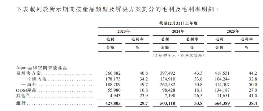 毛利方面,往绩记录期间(2023-2025年),Aqara毛利分别为4.28亿元、5.03亿元及5.64亿元,毛利率分别为29.7%、33.8%、38.4%。可见,Aqara整体毛利率处于稳步上升趋势。