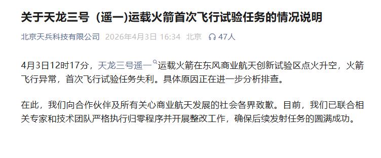 关注公众号,点击公众号主页右上角“ · · · ”,设置星标,实时关注前沿装备汇最新资讯4月3日12时17分,甘肃酒泉,东风商业航天创新试验区。天兵科技(Space Pioneer)在东风商业航天创新试验区新建成的发射台上垂直集成的天龙-3(Tianlong-3)运载火箭的全尺寸模型。图片来源:天兵科技(Space Pioneer)随着倒计时归零,天龙三号遥一运载火箭点火升空。这枚全长72米、起飞质量约600吨的庞然大物,承载着中国商业航天冲击大运力时代的厚望。然而,火箭飞行途中出现异常,首次飞行试验任务以失利告终。天兵科技随后发布声明致歉,表示已联合专家团队严格执行航天故障“归零”程序。对于一家曾以“天龙二号首飞即成功”创造全球民营液体火箭纪录的企业而言,这次挫折来得有些突然。但对于中国商业航天正集体冲击的大运力、可回收技术高峰而言,这又是一次绕不过去的“必要试错”。天龙三号是天兵科技为我国卫星互联网星座建设量身定制的大型液体运载火箭,采用两级液氧煤油构型,全箭长72米,直径3.8米,起飞质量约600吨,起飞推力达855吨。其近地轨道运力可达22吨,能够实现“一箭36星”组网发射。在商业航天领域,22吨级近地轨道运力是一个标志性的门槛。此前,中国民营火箭公司的运力多停留在百公斤级到吨级区间。天龙三号的性能直接对标国际主流的SpaceX猎鹰9号,后者正是全球商业航天发射市场的“主力军”。为了实现这一目标,天兵科技在天龙三号上投入了大量创新技术。火箭一级配置9台“天火十二”液氧煤油发动机并联工作,二级配置1台真空版发动机。其中,“天火十二”发动机拥有四十余项关键创新技术,包括国内首次采用的冷气多次起动技术、自燃点火技术、超大尺寸推力室不锈钢3D打印制造技术等。此外,天龙三号配备了直径4.2米的全碳纤维复合材料整流罩,这是国内商业航天最大的整流罩,也是中国最大的全碳纤维整流罩。天兵科技此前的高光时刻发生在2023年4月。当时,天龙二号中型液体运载火箭成功首飞,使天兵科技成为二十多年来全球第一家首飞即成的民营液体火箭企业。这一成功为其赢得了资本市场的青睐——2025年10月,天兵科技完成近25亿元人民币Pre-D轮和D轮新增融资,并正式报送上市辅导备案。天龙三号,正是建立在天龙二号成功基础上的又一次“大跨越”。根据天兵科技发布的情况说明,天龙三号遥一运载火箭于4月3日12时17分点火升空,火箭飞行出现异常,首次飞行试验任务失利。值得注意的是,这次发射本身就经历了一些波折。原定于4月2日的发射因发射场大风、沙尘等恶劣天气调整至4月3日。最终,首飞未能圆满完成全部预定目标。天兵科技在声明中向合作伙伴及所有关心商业航天发展的社会各界致歉,并表示已联合相关专家和技术团队严格执行航天故障“归零”程序,开展整改工作。所谓“归零”,是中国航天在数十年工程实践中总结出的闭环管理体系,要求故障排查必须完成技术与管理双维度的全流程闭环——定位准确、机理清楚、问题复现、措施有效、举一反三。任务团队在第一时间启动了应急处置程序,本次任务未造成任何人员伤亡,酒泉卫星发射中心已完成现场管控,同步开展飞行数据解析、残骸回收清理等工作。天兵科技方面表示,尽管任务失利,但本次首飞试验已获取真实飞行环境下的关键流程参数和大量实测数据,“为摸清产品在极限工况下性能边界,进一步优化设计,提供火箭可靠性提供了不可替代的验证依据”。2024年6月30日,天龙三号在河南巩义综合试验中心开展一子级九机并联动力系统热试车时,曾因箭体与试验台连接处结构失效发生事故,箭体脱离试车台后在安全区域解体-9。那次事故未造成人员伤亡,但无疑给研制团队敲响了警钟。此后,研制团队严格执行归零程序,完成了127项可靠性改进,新增13项地面验证试验。2025年9月,天兵科技在山东海阳东方航天港成功完成天龙三号一级动力系统全系统海上试车,刷新了国内商业航天液体火箭发动机推力纪录,这也是我国商业航天领域首个海上热试车试验。从地面事故到海上试车成功,再到此次首飞失利,天龙三号的研制历程勾勒出一条典型的航天工程“试错—改进—再试”曲线。多位受访人士向记者表示,看待商业航天的首飞任务,需要区分其性质。天龙三号首飞以载荷入轨和系统飞行验证为核心目标,其本质是为后续执行规模化发射任务的技术闭环验证节点,目的是在真实飞行环境下,检验全新火箭系统在设计、制造、发射全链条的可靠性,暴露隐患。“大型液体火箭由数十万个零部件高度集成,要求动力、结构、控制、分离等多系统高度协同运行。首飞是整个研制流程中系统最复杂、状态最多变、风险最高的验证环节之一。”陆石投资董事长邓钊指出,“任何细微偏差,都可能在复杂系统中引发连锁反应,最终导致偏差。”换言之,首飞的核心目的,就是在风险相对可控的最后验证阶段,用真实飞行数据尽可能多地暴露问题。这与已进入商业发射阶段、搭载高价值卫星的成熟型号飞行任务失利有本质区别。从全球商业航天发展历程来看,大运力可复用运载火箭在早期研制或技术跃迁阶段,经历过多次试验挫折是普遍规律。SpaceX的猎鹰1号火箭在2006年至2008年间连续三次发射失败,直至第四次才成功入轨。Rocket Lab的Electron火箭2017年首飞也因地面设备配