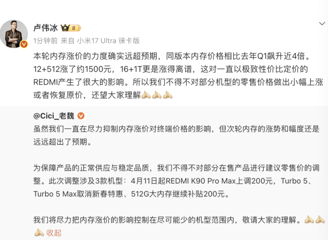 小米集团合伙人、总裁兼手机部总裁卢伟冰称,本轮内存涨价远超预期,价格较去年一季度飙升近 4 倍,12+512GB 版本成本上涨约 1500 元,16+1TB 版本涨幅更大,对 REDMI 影响明显,因此对部分机型小幅涨价或恢复原价。