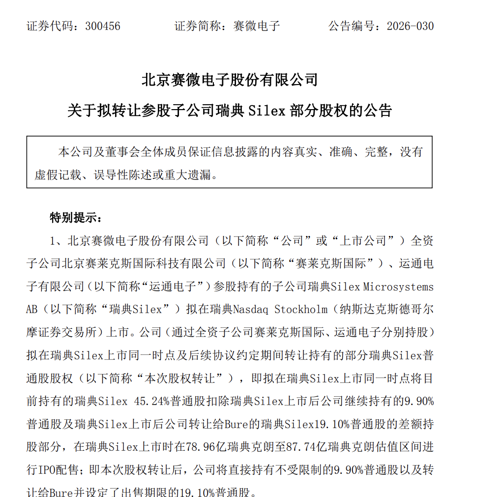 瑞典 Silex 位于瑞典斯德哥尔摩,成立于 2000 年,为全球领先的纯MEMS代工企业,主要从事 MEMS 产品工艺开发及晶圆制造业务。据咨询机构Yole Development 的统计数据,2012 年至今,瑞典 Silex 在全球 MEMS 代工厂营收排名中一直位居前五。赛微电子于2016 年通过发行股份购买资产取得瑞典 Silex 控制权。自收购完成后,瑞典Silex 一直保持良好运营,业务稳步发展,同时助力公司实现战略转型并有力地推动了国内MEMS产业的自主发展。在赛微电子的经营下,2019年,瑞典Silex成为全球最大的 MEMS 纯代工厂,并在2019-2024年度连续6年蝉联全球 MEMS 纯代工厂商排名第一。 近年来,国际地缘政治环境发生深刻变化,同时半导体产业在全球地缘政治博弈中的战略地位日益凸显,经济全球化与国际产业链分工协作面临挑战。由于国际局势的日趋紧张及复杂化,瑞典 Silex 面临的不确定性因素显著增加。若公司继续维持对瑞典 Silex 的控股地位,其业务运营与发展面临的地缘政治相关风险及不确定性可能上升,包括但不限于其与关键客户及供应商伙伴持续稳定合作的潜在挑战,以及由此可能导致的瑞典 Silex 经营风险和价值受损风险。为审慎应对复杂多变的国际形势,最大程度缓解地缘政治环境变化带来的系统性风险,切实维护上市公司及全体股东的长远利益,经公司慎重研究,决定出售瑞典Silex 控制权,同时保留部分少数股权,继续享有瑞典Silex 业务增长收益、保持境内外协作沟通纽带,并为海外业务运营创造更具韧性的发展条件。2025年6月,公司决策转让瑞典 Silex 控制权,本次重大资产出售已于2025 年7 月完成交割,赛微电子将Silex控股权出售给了由Bure Equity和Creades AB牵头的瑞典投资者财团,赛微电子则控股大约45%股权。相关信息参看:刚刚,全球最大MEMS芯片代工厂易主!中国企业出售控股权!瑞典 Silex 从公司的全资子公司转变成为公司的重要参股子公司。本次股权转让前,瑞典 Silex 普通股股权结构如下:赛微电子旗下运通电子持股34.2%,赛莱克斯国际持股11.04%,共计持股45.24%。在不考虑瑞典 Silex 发行新股的情况下,本次股权转让完成后,瑞典Silex普通股股权结构如下(公司持有 9.90%普通股的持股比例不受瑞典Silex 是否发行新股的影响,其他持股比例需以 IPO 新股发行及配售实际交割结果为准):股权转让后,赛微电子旗下赛莱克斯北京持股9.9%,Bure为最大持股股东,持股36.09%。瑞典Silex 2025年度营收13.85亿瑞典克朗(约合9.98亿元人民币),净利润2.69亿瑞典克朗(约合1.94亿元人民币),2024年度营收12.26亿瑞典克朗(约合8.84亿元人民币),净利润2.73亿瑞典克朗(约合1.97亿元人民币)。若瑞典 Silex 上市成功及本次股权转让实施落地,不会导致公司合并报表范围发生变化,瑞典 Silex 仍为公司参股子公司,不会影响公司正常生产经营活动,在扣除相关费用及成本后预计将对公司年度利润表科目产生正向影响(尚无法核算准确金额),给公司带来可观的现金资产和流入,有助于公司优化资产负债结构,进一步回笼资金并集中资源,为公司的国内业务发展、海外业务拓展、未来业务规划奠定较好的基础,符合公司当前的实际情况和中长期发展战略。基于本次交易的总体安排,公司此前向瑞典 Silex 委派的包括张阿斌先生在内的两位董事将于上市成功同一时点从瑞典 Silex 辞任,结合本次股权转让实施后公司对瑞典 Silex 的持股比例将实质下降,公司对瑞典Silex 决策的影响力将较以往显著降低;剩余持股的中长期收益情况将取决于瑞典Silex 自身的业务发展情况以及上市后所处资本市场的整体环境,有待后续的持续跟踪观察。您对本文有什么看法?欢迎留言分享!