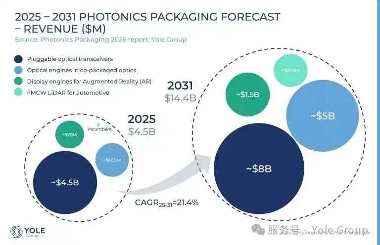 共封装光学(CPO)正成为应对AI驱动的带宽与能耗挑战的关键技术。 预计到 2031 年,CPO相关的光子封装市场规模将接近 50 亿美元。