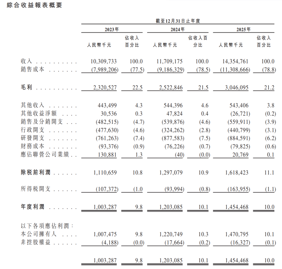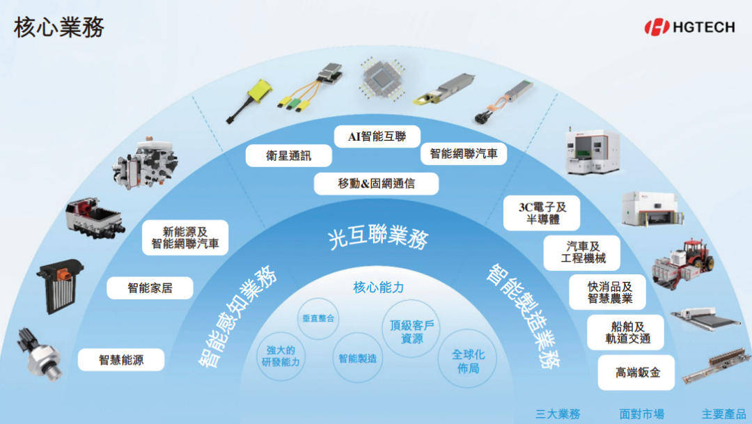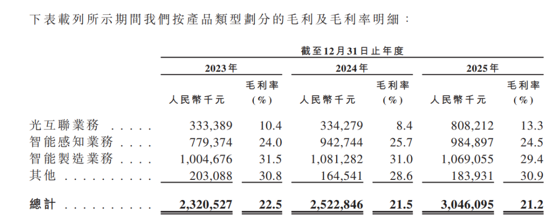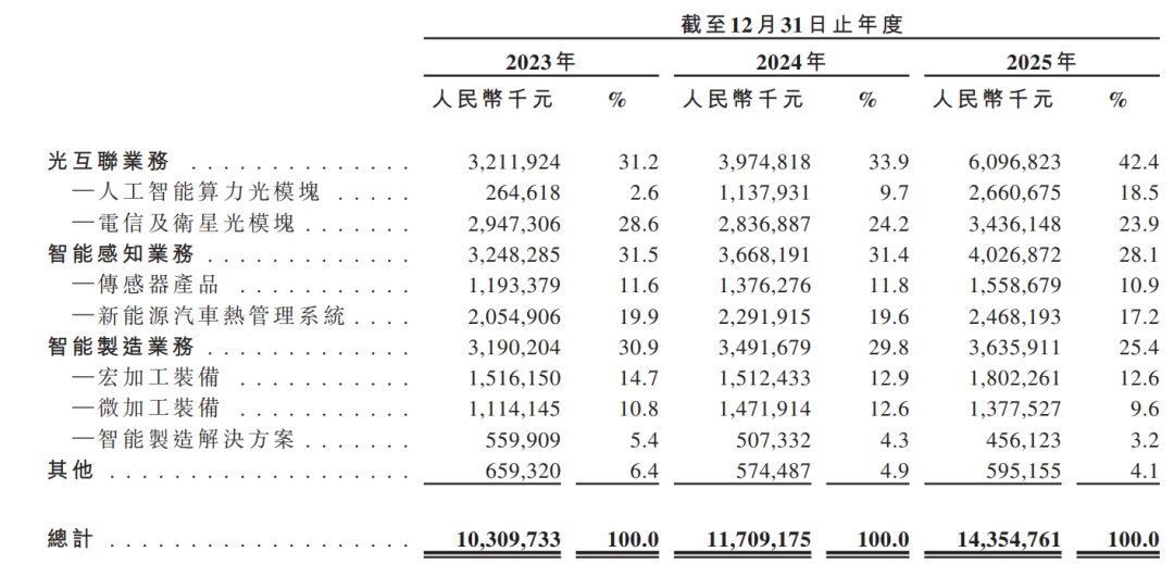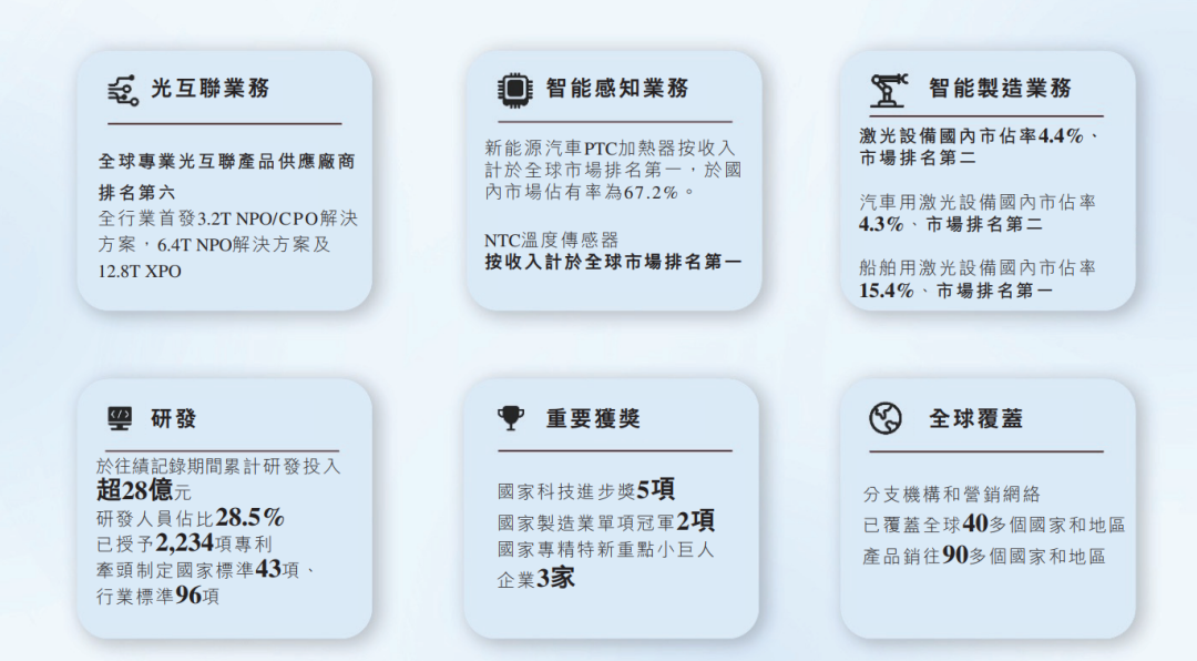 光互联业务市场地位,2025年,按光互联产品收入计,华工科技收入61亿元,市场份额3.8%,位列全球专业光互联产品供应商第6。招股书显示,2025年全球光互联市场规模为1624亿元,其中,TOP 6光互联供应商合计占64.9%的市场份额——可见全球光互联产业市场高度集中。智能制造业务市场地位,华工科技是中国第二大激光装备制造商,2025年,实现营收41亿元,在中国市场的市场份额为4.4%。在中国汽车激光装备领域,华工科技是市场份额第2的供应商,相关收入为11亿元,市场份额4.3%。2025年,华工科技是中国船舶激光装备市场最大供应商,营收4亿元。主要财务数据方面,往绩记录期间(2023-2025年),华工科技实现营收103.1亿元、117.09亿元、143.55亿元,净利润10.33亿元、12.03亿元、14.54亿元。其中,华工科技2023-2024年度营收增长率13.6%,2024-2025年度营收增长率22.6%,华工科技营收增速加快。往绩记录期间(2023-2025年),华工科技主要营收来自光互联业务、智能感知业务、智能制造业务三大板块。智能感知业务包括传感器产品、新能源汽车热管理系统两部分,往绩记录期间(2023-2025年),华工科技智能感知业务营收分别为32.48亿元、36.68亿元、40.27亿元,占总营收比例分别为31.5%、31.4%、28.1%,毛利率分別為24.0%、 25.7%及24.5%。稳定市场地位:我们的新能源汽车热管理系统覆盖大多数主要的中国品牌及合 资品牌,并已获多家国际顶级车企订单。