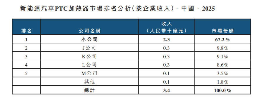华工科技是中国新能源汽车PTC加热器供应商第一名,2025年,实现收入23亿元,占中国市场份额的67.2%。2025 年 , 中国新能源汽车PTC加热器市场规模约34亿元,TOP 5供应商占据98.2%市场份额。