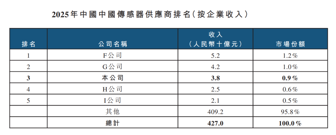 IPO招股书中,披露了中国传感器产业市场格局及华工科技传感器业务营收情况,2025年,华工科技传感器收入为38亿元,市场份额为0.9%,排名中国传感器供应商第三。