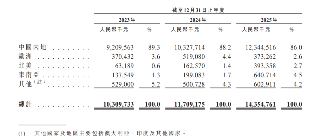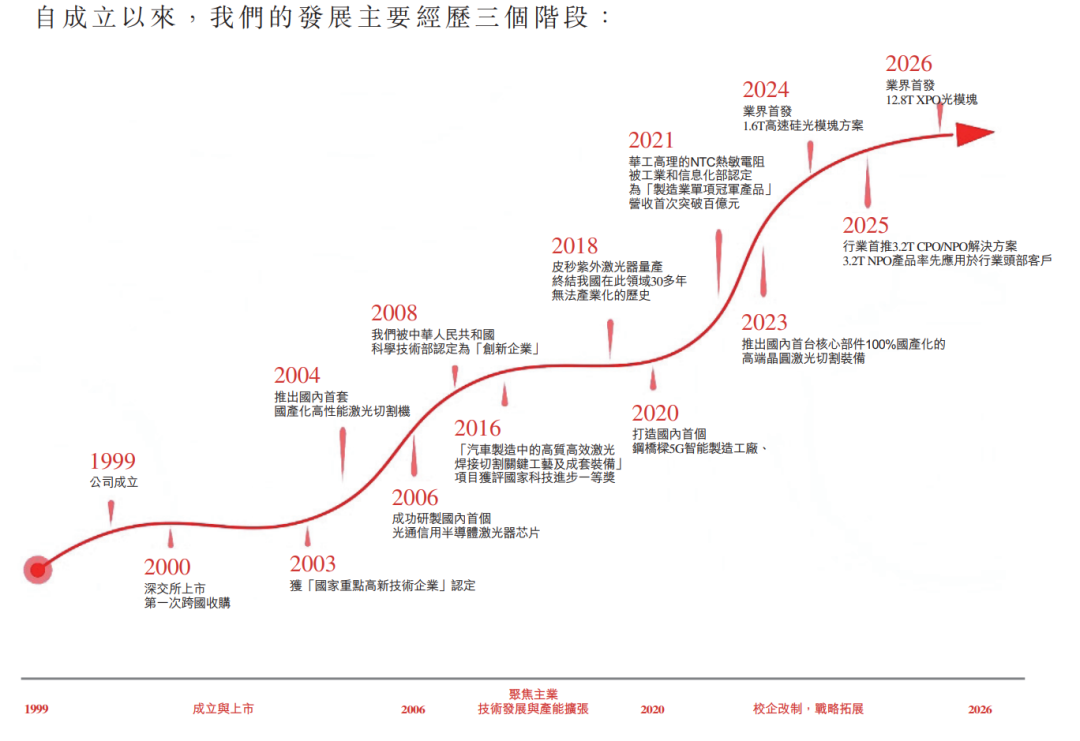 光互联业务包括人工智能算力光模块、电信及卫星光模块两部分,往绩记录期间(2023-2025年),光互联业务营收分别为31.12亿元、39.75亿元、60.97亿元,占总营收比例为31.2%、33.9%、42.4%,毛利率分别为24.0%、25.7%及24.5%。智能制造业务包括宏加工装备、微加工装备、智能制造解决方案三部分,往绩记录期间(2023-2025年),智能制造业务营收分别为31.9亿元、34.92亿元、36.36亿元,占总营收比例30.9%、29.8%、25.4%,毛利率分别为31.5%、31.0%及29.4%。往绩记录期间(2023-2025年),华工科技实现毛利分别为23.21亿元、25.23亿元、30.46亿元,毛利率分别为22.5%、21.5%、21.2%。绩记录期间(2023-2025年),按地区销售情况看,华工科技销售地区有中国内地、欧洲、北美、东南亚及其他地区。华工科技绝大部分收入来自中国内地,占比分别为89.3%、88.2%、86%。研发投入方面,往绩记录期间(2023-2025年),华工科技研发投入分别为8.02亿元、9.93亿元、10.92亿元,分别占同年总营收的7.8% 、 8.5% 及 7.6%。截至2025 年12月 31日 , 华工科技研发团队共有2698人,占员工总数的28.5%。其中790人持有硕士或以上学位, 主修专业主要包括电信、计算机科学、自动化、物理、材料科学、机械工程及光电子。