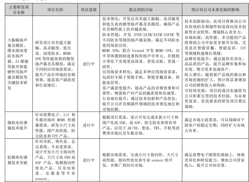 海量传感器知识、行业报告,请在公众号对话框回复关键词【资料下载】获取,部分资料查看《传感器专业知识资料100+,总有一份适合你~》这里👇关注我,记得点右上角菜单栏•••键👉设为星标⭐今日(4月16日),A股传感器上市公司共达电声,发布2025年业绩报告,主要财务数据有:报告期内,公司实现营业收入14.4亿元,同比增长 18.80%;实现归属于上市公司股东的净利润7420.92万元,同比增长 0.79%,基本每股收益 0.2060 元。共达电声拟每 10 股派 0.3 元(含税),不送红股,不以资本公积转增股 本。截至本公告日,公司总股本为 363,776,000 股,以此为基数计算合计拟派发现金红利1091.33万元(含 税)。共达电声专业的电声元器件及电声组件制造商和服务商、电声技术解决方案提供商,主营业务为微型精密电声元器件 及电声组件的研发、生产和销售及电子元器件分销,主要产品包括 MEMS 声学传感器、驻极体声学传感器(ECM)、车载 语音模组、RNC 振动传感器模组、微型扬声器/受话器及其阵列模组、车载显示屏、K 歌麦克风、车载无线充、车载 USB 充、汽车喇叭、毫米波雷达模组等。公司产品广泛应用于智能手机、智能穿戴、汽车电子、智能家居、物联网、AI 玩具 等领域。报告期内,共达电声汽车及工业应用实现营业收入7.24亿元,占总营业收入的 50.30%,同比增长 18.25%;消费电子实现营业收入7.16亿元,占总营业 收入的 49.70%,同比增长 19.36%。可见,汽车&工业、消费电子两大应用领域为共达电声的收入核心。报告期内,公司持续聚焦精密电声元器件、零组件业务、半导体封测业务、汽车电子业务,进一步提升公司盈利能 力和企业规模。2025年,共达电声研发支出投入8725.9万元,同比增长25.36%,目前共达电声共有研发人员351人,占总员工比例17.86%。2025年,共达电声主要研发项目有:大振幅扬声器及模组、 潜水级深度防水扬声器、AI 眼镜 等新兴智能 硬件用扬声 器及模组等 关键技术研发;微机电传感 器技术提升;驻极体传感 器技术突破;微压差传感 器关键技术 及指标突破;车载毫米波 雷达的产品 开发等。公司坚持以技术为依托,以市场为导向,以质量为保障,以服务为目标,以人才为根本,打造核心竞争力,具体表 现在以下几个方面: 公司立足于微型电声元器件及其组件、模组、系统等产品的研发、生产和销售,拥有一支高素 质、专业化的研发队伍,通过整合微型驻极体麦克风、微型扬声器/受话器、硅微麦克风、车载通讯、人机交互等多品种 产品研发生产技术,形成了既相互独立又互为支撑的研发平台;不但可以自主选择技术路线进行研发,迅速响应客户需 求,而且能够有效整合资源,为客户提供一流的电声整体声学解决方案共达电声作为国家知识产权示范企业,注重知识产权保护、管理与布局,营造保护和尊重知识产权的良好氛围,强 化知识产权全链条保护。截至报告期末,公司已获授权专利 550 项,其中发明专利 151 项。在申请专利 80 项。自主创新 能力不断增强。面对复杂的国内外宏观经济形势和消费电子行业增速放缓的趋势,公司管理层审时度势,与时俱 进,在持续巩固传统精密零组件业务核心竞争优势的同时,积极进行战略创新转型,紧紧把握大环境下的各种创新机遇。 依托公司的全球优质客户资源以及稳固良好的客户合作关系,以市场和技术为导向,持续拓展智能车载、智能家居、智 能穿戴、物联网、AI 玩具等领域内新的业务增长点。紧跟全球一流客户的战略创新步伐,优化公司产品结构,支持战略 产品开发,继续巩固和深耕公司客户资源优势。 公司深耕电声领域多年,主要产品具有较高的市场竞争力。公司不断提升生产工艺水平,为产品 质量的提高打下了坚实的基础。公司主要产品的零部件自制配套,确保产品质量和生产成本都能得到有效控制。公司独 立研发生产的自动组装线和自动检测装置,提高了产品的一次合格率、一致性和稳定性,也减少了人工成本、提高了生 产效率。公司全自动封装设备均采用国际一流品牌,可实现在线 100%AOI 及 MES 物料追踪功能;在产品测试方面,公司 除了拥有独特的声学相位调制技术,可有效提升小尺寸麦克风拾取指向性,增强声源信号采集强度外,还拥有齐全的试 验、检测设备,并通过了 CNAS 认可,可以为第三方产品的性能出具检测报告。基于公司优异的质量控制水平,公司是众 多重要客户的最佳供应商和优秀供应商。 公司快速发展的同时,公司核心管理团队一如既往地保持稳健高效的作风。建立了严格规范的管理体 系,应对智能时代消费电子产品升级换代快、产品品质要求高、加工精度高、交货周期短、客户认证难的挑战。公司始 终关注并持续推动核心管理团队的国际化、专业化、年轻化,积极吸纳来自于国际领先企业的高级管理人才和专业人才 加入到核心管理团队中。同时,公司加强人才梯队建设,越来越多的年轻人才在培养与实践中逐步成长为公司管理团队 的中坚力量。公司的管理团队兼具经验与活力,在新的市场环境和高强度的行业竞争中,持续推动着公司的稳定快速发 展。您对本文有什么看法?欢迎留言分享!