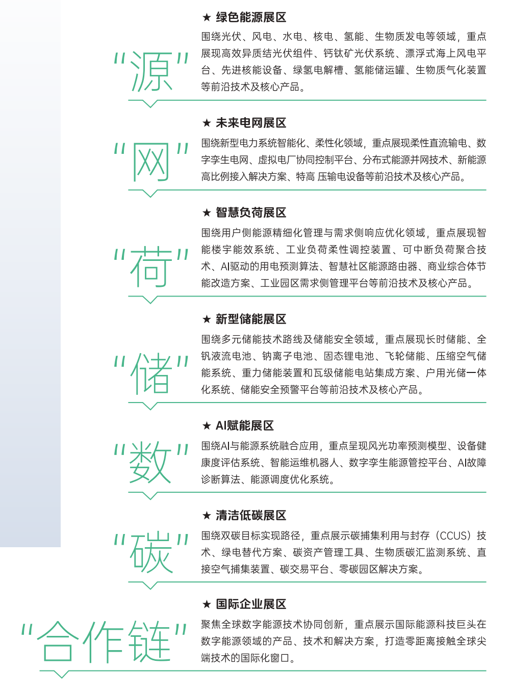 ●馆内搭建充电桩、新型电力系统、 Al 应用等多场 景交互体验区,通过案例演示与互动体验,让展商核 心技术与产品直观触达观众。
