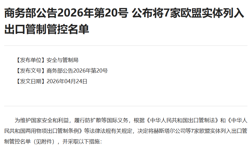 海量传感器知识、行业报告,请在公众号对话框回复关键词【资料下载】获取,部分资料查看《传感器专业知识资料100+,总有一份适合你~》这里👇关注我,记得点右上角菜单栏•••键👉设为星标⭐今日(4月24日),商务部发布2026年第20号公告,将7家欧盟实体列入出口管制管控名单。值得留意的是,名单中包含一家欧盟传感器实体。一、禁止出口经营者向上述7家实体出口两用物项,禁止境外组织和个人将原产于中华人民共和国的两用物项转移或提供给上述7家实体;正在开展的相关活动应当立即停止。二、特殊情况下确需出口的,出口经营者应当向商务部提出申请。此前,我国商务部新闻发言人表示,在措施公布前,中方已通过双边出口管制对话机制,向欧方通报了有关情况。“需要强调的是,中方依法列单的行为仅针对少数欧盟涉军实体,相关实体曾参与对台军售或与台勾连,相关措施仅针对两用物项,不影响中欧正常经贸往来”。“诚信守法的欧盟实体完全无需担心。中国政府将一如既往地与各国一道,坚定维护世界和平和周边地区稳定,共同保障全球产业链供应链稳定”。出口管制管控名单