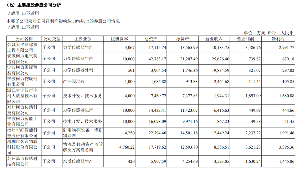 海量传感器知识、行业报告,请在公众号对话框回复关键词【资料下载】获取,部分资料查看《传感器专业知识资料100+,总有一份适合你~》这里👇关注我,记得点右上角菜单栏•••键👉设为星标⭐今日(4月27日),国产力传感器龙头企业柯力传感,发布2025年度报告,主要财务数据有:2025年度,柯力传感实现营收15.58亿元,同比增长20.33%;归母净利润3.41亿元,同比增长30.73%;扣非归母净利润2.14亿元,同比增长11.06%;经营性现金流3.86亿元,同比增长127.48%;基本每股收益1.21元,同比增长31.52%;柯力传感拟向全体股东每10股派发现金红利3.64元(含税),现金分红总额1.02亿元,占净利润比例为30.02%。可见,2025年度,柯力传感营收、净利润均实现了不错的增长态势。2025年度业绩增长的主要原因,主要系新增并表子公司及2024年并购子公司在报告期全年并表影响所致。2025年,柯力传感完成了对国内安全光栅头部企业意普兴的并购,实现由参股到控股的转变,意普兴的业绩并表,为柯力传感带来6888.23万元的营收。同日,柯力传感一并发布2026年一季度业绩报告,主要财务数据有:一季度,柯力传感实现营收3.58亿元,同比增长13.34%;归母净利润4111.93万元,同比下降45.65%。扣非归母净利润5151.75万元,同比增长20.76%。一季度柯力传感营收、扣非归母净利润均有不错的增长势头,归母净利下滑,主要由于公司持有的驰诚股份公允价值下降。分产品营收情况方面,柯力传感拥有庞大的传感器产品体系,包括:力学传感器及仪表系列、其他物理量传感器系列-电流电压、其他物理量传感器系列-温度、其他物理量传感器系列-水质、其他物理量传感器系列-振动、其他物理量传感器系列-光电、工业物联网及系统集成、平台型产品系列等。其中,力学传感器及仪表系列营收6.2亿元,毛利率43.29%,为柯力传感最大单一营收业务;工业物联网及系统集成营收5.89亿元,毛利率47.93,为第二大营收业务,其余业务情况见下表。柯力传感主要营收来自国内,国内营收达11.81亿元,毛利率43.04%。柯力传感成立于1995年,2019年8月6日在上海证券交易所上市。柯力传感主要研制和生产各类传感器以及工业物联网系统及多场景应用解决方案,是全球较大钢制传感器制造企业和传感器产业森林开拓建设者,目前,柯力传感已涉足称重、光电、水质、光纤测温、光幕、气体、位移、电量、温湿度压力、流量、3D视觉、激光测距、振动传感器、机器人多维力传感器等近二十种传感器。值得一提的是,作为国产传感器龙头企业,柯力传感走出了一条独特的产业发展路线——“传感器森林”战略,致力于成为国内具有领先优势、国际具有一定影响力的智能传感器及物联网系统解决方案提供商。在该战略指导下,柯力传感近年来持续对外进行大规模并购、投资活动。截止2025年,柯力传感持有驰诚股份、重庆钢铁、正邦科技等3家A股上市公司的股权,其中,驰诚股份系公司于驰诚股份 Pre-IPO 阶段参与战略投资取得的股份;重庆钢铁、正邦科技系公司通过参与重庆钢铁、正邦科技债务重组取得的股份。驰诚股份是我国气体传感器领先企业。此外,截止2025年,柯力传感旗下主要子公司及对公司净利润影响达10%以上的参股公司多达12家,包括华虹智能、久通物联、禹山传感、意普兴柯力传感还发起成立了两支私募投资基金:宁波江北创业投资合伙企业(有限合伙),规模4.72亿元;宁波传感谷创业投资基金合伙企业(有限合伙),规模7000万元。柯力传感的核心市场竞争力:多平台优势、推动与投资企业的研发协作、3大产业园区已入驻企业超 680 家,总产值超 21 亿元公司长期深耕称重、测力等主业,并持续向水质、振动、光纤测温、电量、温湿压、位移、气体、流量、光电、3D 视觉、激光测距、安全光栅、六维力/力矩、力学测试设备等方向拓展,形成覆盖工业测控、智慧物流、能源环境监测及新型感知场景的产品体系。较为完整的产品矩阵有助于公司围绕客户需求开展组合供给和场景协同。报告期内,公司完成了对国内安全光栅头部企业意普兴的并购,实现由参股到控股的转变,进一步强化了在光电传感器领域的布局。 公司聚焦机器人传感器战略布局与共性技术平台建设,重点突破六维力、MEMS 硅基应变力矩、高速推拉力等核心传感器,推进小薄型六维力标准品开发定型,深化与猿声先达、他山科技、北微传感等参股公司在芯片、算法等方面的协同。推动六大技术平台及检测资源共享,完善研发基金运作机制,支持前瞻性与联合研发项目,强化AI 与物联网、多物理量融合、MEMS 工艺等前沿研究。持续研发投入为主业升级、产品迭代和新业务培育提供了支撑。 公司依托宁波、安徽、郑州三大基地,持续推进自动化、柔性化、精益化制造,具备较强的批量制造、质量控制和快速交付能力。随着产品类别持续扩展,公司制造体系对多品种、快交付和一致性控制的支撑能力进一步增强。公司全面推进“更聚焦、更量化、更深耕、更硬核、更体系、更落地”的管理导向,系统提升集团化赋能与协同效能。通过构建以“质量、交付、成本、创新”为核心的 DBS 运营体系,强化 4P(人、计划、流程、业绩)管理机制,集团在战略导向、投资风控、人才梯队、研发平台、制造精益、品牌市场、国际拓展等关键领域形成了系统赋能能力。公司围绕“传感器森林”战略推进产业投资和资源整