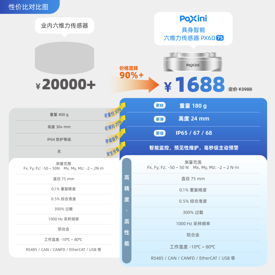 值得关注的是,据官方披露,该产品将是全球最具“性价比”的霍尔六维力传感器——该款产品性能全面对标国内外顶尖万元级六维力传感器,限量活动价格 1688 元(限量前888个,先到先得),在实现长期稳定可靠、超薄轻量化、高动态响应与工业级超长使用寿命的同时,价格仅占约传统方案的 1/10,真正助推六维力传感器走向规模化普惠应用。