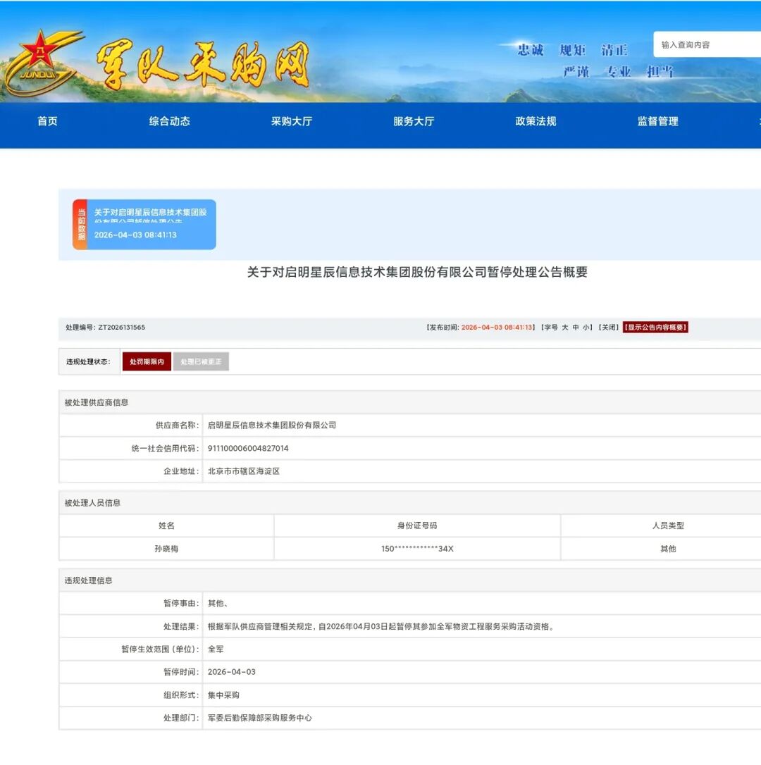 关注公众号,点击公众号主页右上角“ · · · ”,设置星标,实时关注前沿装备汇最新资讯2026年4月7日,当大多数企业刚刚结束清明假期复工时,网络安全行业的明星企业——启明星辰信息技术集团股份有限公司(002439,下称“启明星辰”)却陷入了前所未有的舆论风暴。军队采购网的一则公告,将这家中移动旗下的“网安国家队”推向了风口浪尖。公告显示,因在采购活动中涉嫌违规失信,自4月3日起,启明星辰集团被